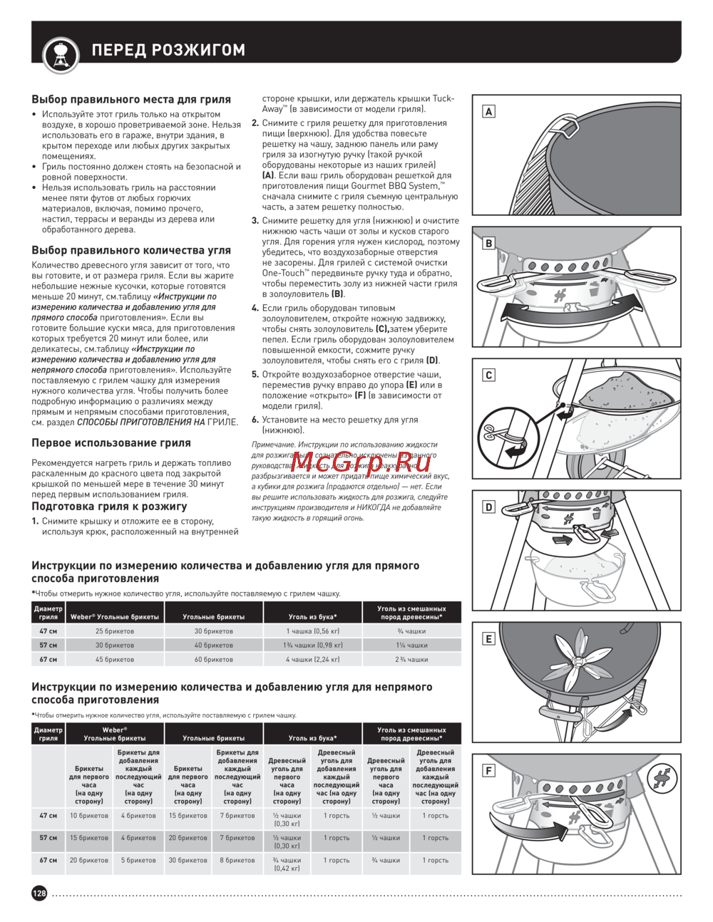 - Количество древесного угля зависит от того что вы готовите и от размера гриля если вы жарите небольшие нежные кусочки которые готовятся меньше 20 минут см таблицу инструкции по измерению количества и добавлению угля для прямого способа приготовления если вы готовите большие куски мяса для приготовления которых требуется 20 минут или более или деликатесы см таблицу инструкции по измерению количества и добавлению угля для непрямого способа приготовления используйте поставляемую с грилем чашку для измерения нужного количества угля чтобы получить более подробную информацию о различиях между прямым и непрямым способами приготовления см раздел способы приготовления на гриле p.19