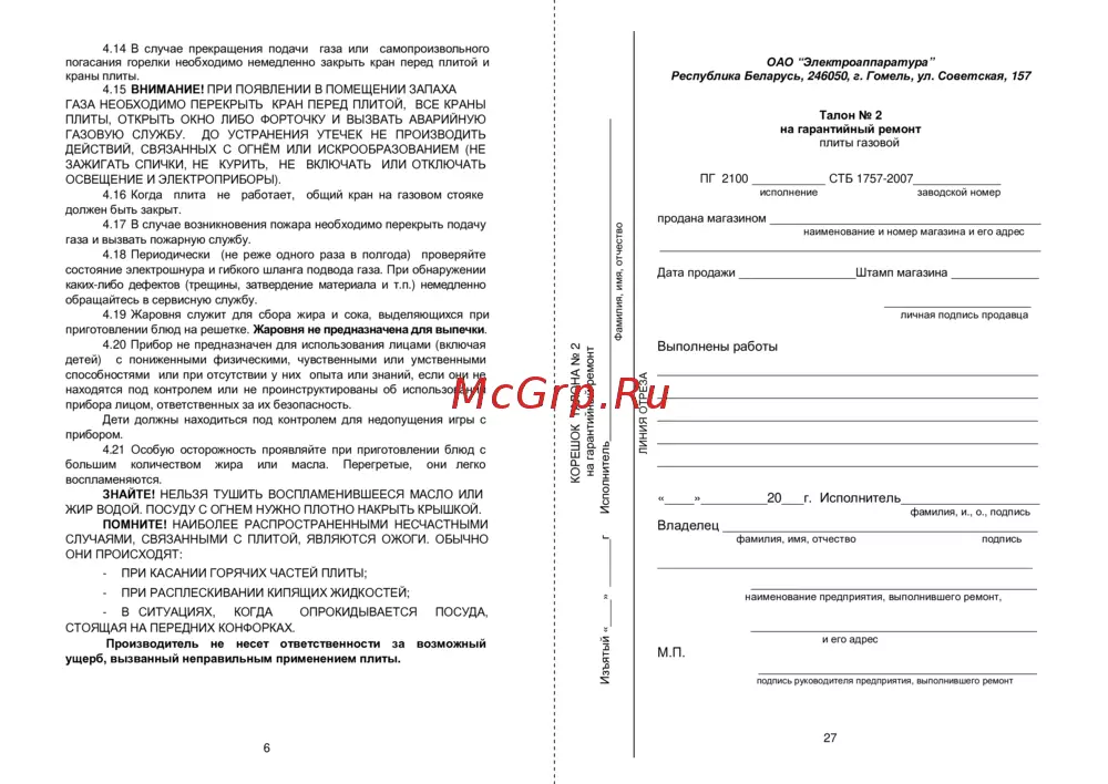 состояние электрошнура и гибкого шланга подвода газа. При обнаружении