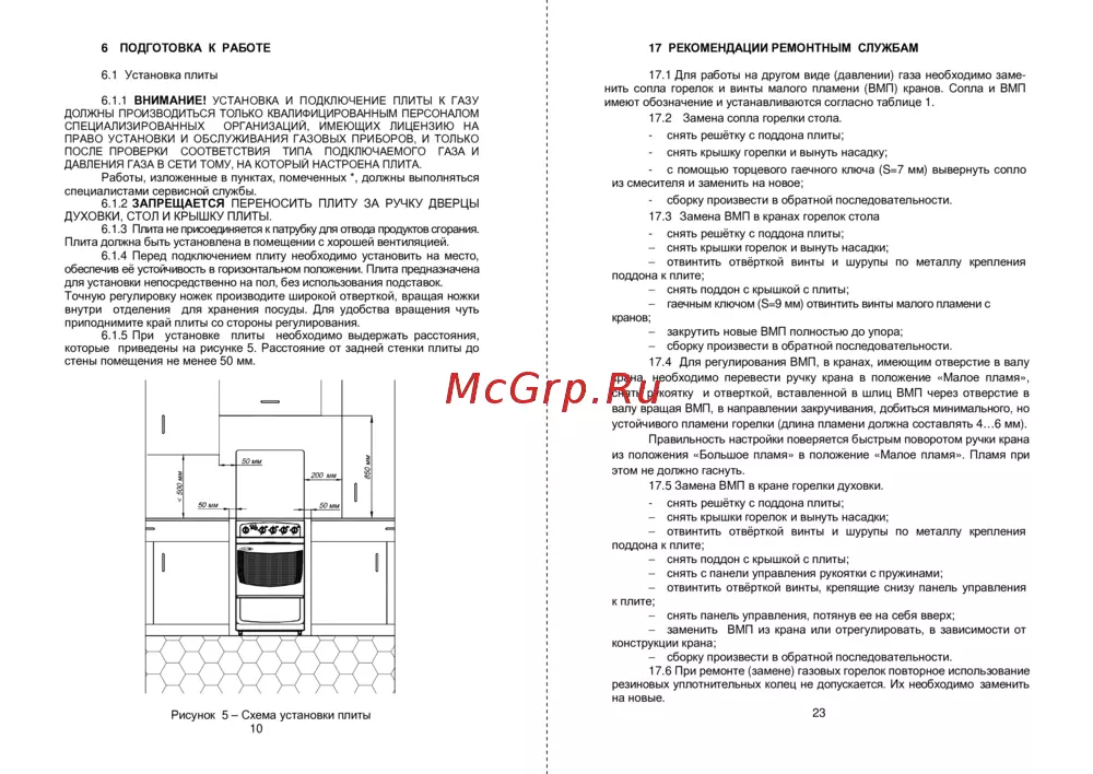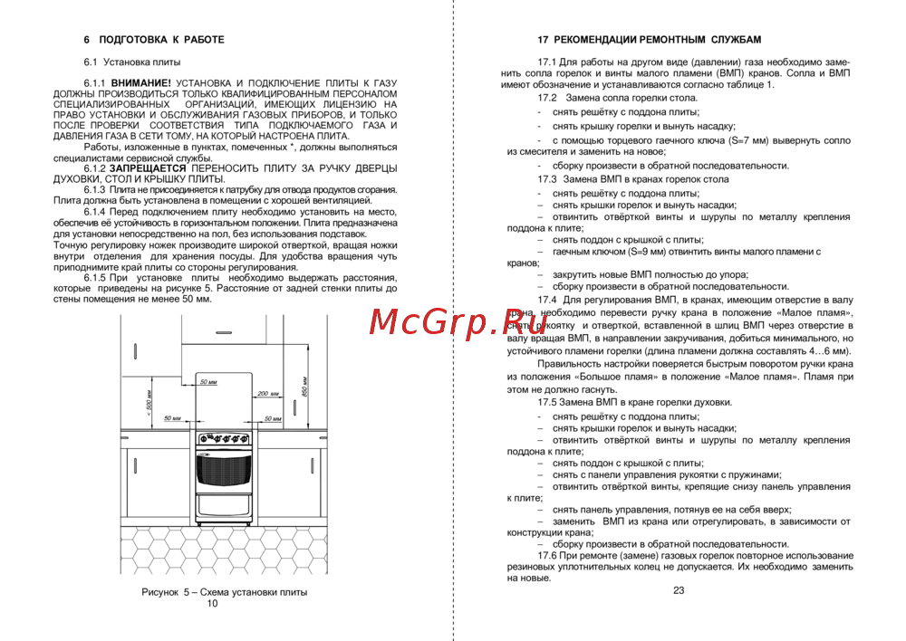 6.1.1 ВНИМАНИЕ! УСТАНОВКА И ПОДКЛЮЧЕНИЕ ПЛИТЫ К ГАЗУ