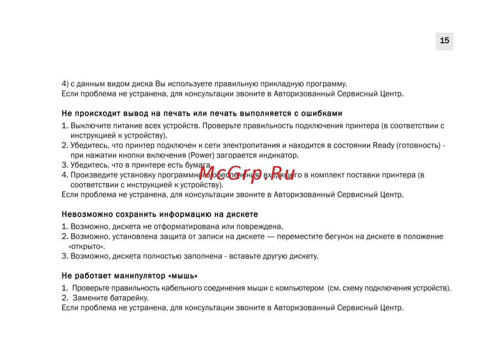 15 4 с данным видом диска Вы используете правильную прикладную программу Если проблема не устранена для консультации звоните в Авторизованный Сервисный Центр Не происходит вывод на печать или печать выполняется с ошибками 1 Выключите питание всех устройств Проверьте правильность подключения принтера в соответствии с инструкцией к устройству 2 Убедитесь что принтер подключен к сети электропитания и находится в состоянии Ready готовность при нажатии кнопки включения Power загорается индикатор 3 Убедитесь что в принтере есть бумага 4 Произведите установку программного обеспечения входящего в комплект поставки принтера в соответствии с инструкцией к устройству Если проблема не устранена для консультации звоните в Авторизованный Сервисный Центр Невозможно сохранить информацию на дискете 1 Возможно дискета не отформатирована или повреждена 2 Возможно установлена защита от записи на дискете переместите бегунок на дискете в положение открыто 3 Возможно дискета полностью заполнена вставьте другую дискету Не работает манипулятор мышь 1 Проверьте правильность кабельного соединения мыши с компьютером см схему подключения устройств 2 Замените батарейку Если проблема не устранена для консультации звоните в Авторизованный Сервисный Центр