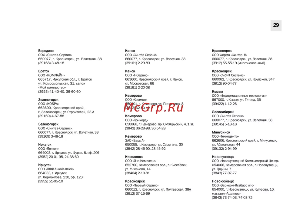 29 Бородино ООО Синтез Сервис660077 г Красноярск ул Взлетная 38 39168 3 48 18 Канск ООО Синтез Сервис660077 г Красноярск ул Взлетная 38 39161 2 29 83 Красноярск ООО Фирма Синтез Н660077 г Красноярск ул Взлетная 38 3912 55 55 19 многоканальный Братск ООО КОМЛАЙН665717 Иркутская обл г Братск ул Комсомольская 31 салон Мой компьютер 3953 41 40 40 36 60 60 Канск ООО Т Се ре ис663600 Красноярский край г Канск ул Московская 66 39161 2 20 08 Красноярск ООО СибИТ Системо660062 г Красноярск ул Крупской 34Г 3912 90 04 77 Зеленогорск ООО КОБРА663690 Красноярский край г Зеленогорск ул Строителей 23 А 39169 4 67 88 Зеленогорск ООО Синтез Сервис660077 г Красноярск ул Взлетная 38 39169 3 48 18 Иркутск ООО Лептон664003 г Иркутск ул Фурье 8 оф 206 3952 20 01 95 24 38 60 Иркутск ООО ПКФ Анком плюс664033 г Иркутск ул Лермонтова 130 оф 123 3952 51 05 10 Кемерово ООО Коммон650001 г Кемерово ул Потемкина 8 3842 62 50 12 Кемерово ООО Конкорд650066 г Кемерово пр Октябрьский 4 1 зт 3842 36 28 98 36 54 28 Кызыл ООО Информационные технологии667000 г Кызыл ул Титова 36 39422 1 12 26 Лесосибирск ООО Синтез Сервис660077 г Красноярск ул Взлетная 38 39145 5 18 18 Кемерово ЗАО Барс А650055 г Кемерово ул Сарыгина 30 3842 28 45 90 28 45 92 Минусинск ООО Техноценгр662606 Красноярский край г Минусинск ул Абаканская 44 39132 2 94 99 Киселевск ООО Янс Комплекс652700 Кемеровская обл г Киселёвск ул Унжакова 14 38464 2 10 81 Новокузнецк ООО Новокузнецкий Компьютерный Центр654066 Кемеровская обл г Новокузнецк ул Грдины 7 3843 77 07 77 Красноярск ООО Первый Сервис660012 г Красноярск ул Полтавская 38А 3912 37 15 69 Новокузнецк ООО Эвриком Кузбасс и К654000 г Новокузнецк ул Кутузова 10 магазин Архимед 3843 73 74 03 74 03 72