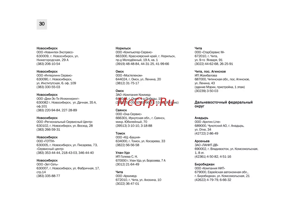 30 Новосибирск ООО Новинтех Экспресс630009 г Новосибирск ул Нижегородская 29 А 383 206 10 54 Норильск ООО Компьютер Сервис663300 Красноярский край г Норильск пр д Молодёжный 19 А кв 1 3919 48 48 84 44 31 25 41 99 66 Чита ООО СтарСервис М672010 г Чита ул 9 го Января 91 3022 44 62 68 26 25 91 Новосибирск ООО Интерлинк Сервис630090 г Новосибирск ул Институтская 6 оф 109 383 330 55 03 Омск ООО Мостелеком644024 г Омск ул Ленина 20 3812 31 75 17 Чита пос Агинское ИП Жамбалова 687000 Читинская обл пос Агинское ул Ленина 43 здание Мэрии пристройка 1 этаж 30239 3 50 03 Новосибирск ООО Джи Эс Ти Инжиниринг630082 г Новосибирск ул Дачная 35 А оф 101 383 220 94 84 227 28 89 Новосибирск ООО Региональный Сервисный Центр630102 г Новосибирск ул Восход 28 383 266 59 31 Новосибирск ООО гопи630005 г Новосибирск ул Писарева 73 Сервисный центр1383 353 44 44 218 43 03 346 44 40 Новосибирск ООО Зет Сеты630007 г Новосибирск ул Фабричная 17 сгр 14 383 335 88 77 Омск ЗАО Компания Ком мед644048 г Омск б р Победы 10 3812 53 05 30 31 66 37 53 88 06 факс Саянск ООО Ока Сервио 666301 Иркутская обл г Саянск микр Юбилейный 70 39513 3 10 10 3 18 88 Томск ООО КЦ Башня634000 г Томск ул Косарева 33 3822 56 56 58 Улан Удэ ИП Голева С Н 670000 г Улан Уда ул Борсоева 7 А 3012 21 64 49 Чита ООО Архимед672010 г Чита ул Анохина 10 3022 36 47 01 Дальневосточный федеральный округ Анадырь ООО Арктик Цпе689000 Чукотский АО г Анадырь ул Огке 34 42722 2 86 49 Арсеньев ЗАО ЛАНИТ ДВ690002 г Владивосток ул Комсомольская 1 8эг 42361 4 50 82 4 51 16 Биробиджан ООО Компания НИТ679000 Еврейская автономная обл г Биробиджан ул Комсомольская 21 42622 4 79 79 6 66 32
