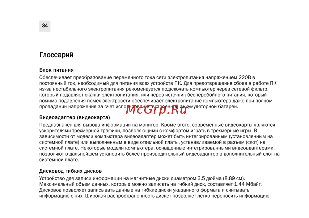 34 Глоссарий Блок питания Обеспечивает преобразование переменного тока сети электропитания напряжением 220В в постоянный ток необходимый для питания всех устройств ПК Для предотвращения сбоев в работе ПК из за нестабильного электропитания рекомендуется подключать компьютер через сетевой фильтр который подавляет скачки электропитания или через источник бесперебойного питания который помимо подавления помех электросети обеспечивает электропитание компьютера даже при полном пропадании напряжения за счет использования встроенной аккумуляторной батареи Видеоадаптер видеокарта Предназначен для вывода информации на монитор Кроме этого современные видеокарты являются ускорителями трехмерной графики позволяющими с комфортом играть в трехмерные игры В зависимости от модели компьютера видеоадаптер может быть интегрированным установленным на системной плате или выполненным в виде отдельной платы устанавливаемой в разъем слот на системной плате Некоторые модели компьютера оснащенные интегрированными видеоадаптерами позволяют в дальнейшем установить более производительный видеоадаптер в дополнительный слот на системной плате Дисковод гибких дисков Устройство для записи информации на магнитные диски диаметром 3 5 дюйма 8 89 см Максимальный объем данных которые можно записать на гибкий диск составляет 1 44 Мбайт Дисковод позволяет записывать данные на гибкие диски указанного формата и считывать информацию с них Широкая распространенность дискет позволяет легко переносить информацию
