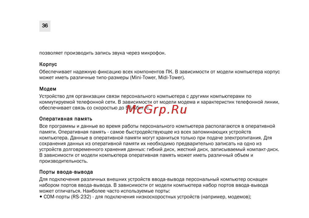 36 позволяет производить запись звука через микрофон Корпус Обеспечивает надежную фиксацию всех компонентов ПК В зависимости от модели компьютера корпус может иметь различные типо размеры Mini Tower Midi Tower Модем Устройство для организации связи персонального компьютера с другими компьютерами по коммутируемой телефонной сети В зависимости от модели модема и характеристик телефонной линии обеспечивает связь со скоростью до 56 Кбит с Оперативная память Все программы и данные во время работы персонального компьютера располагаются в оперативной памяти Оперативная память самое быстродействующее из всех запоминающих устройств компьютера Данные в оперативной памяти могут храниться только при подаче электропитания Для сохранения данных из оперативной памяти их необходимо предварительно записать на одно из устройств долговременного хранения данных гибкий диск жесткий диск записываемый компакт диск В зависимости от модели компьютера оперативная память может иметь различный объем и производительность Порты ввода вывода Для подключения различных внешних устройств ввода вывода персональный компьютер оснащен набором портов ввода вывода В зависимости от модели компьютера набор портов ввода вывода может отличаться Наиболее часто используемые порты СОМ порты RS 2321 для подключения низкоскоростных устройств например модемов