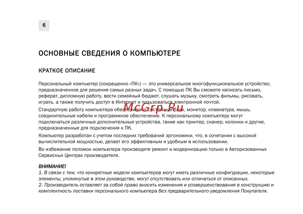 6 ОСНОВНЫЕ СВЕДЕНИЯ О КОМПЬЮТЕРЕ КРАТКОЕ ОПИСАНИЕ Персональный компьютер сокращенно ПК это универсальное многофункциональное устройство предназначенное для решения самых разных задач С помощью ПК Вы сможете написать письмо реферат дипломную работу вести семейный бюджет слушать музыку смотреть фильмы рисовать играть а также получить доступ в Интернет и пользоваться электронной почтой Стандартную работу компьютера обеспечивают системный блок монитор клавиатура мышь соединительные кабели и программное обеспечение К персональному компьютеру могут подключаться различные дополнительные устройства такие как принтер сканер колонки и другие предназначенные для подключения к ПК Компьютер разработан с учетом последних требований эргономики что в сочетании с высокой вычислительной мощностью делает его эффективным и удобным в использовании Во избежание поломок компьютера производите ремонт и модернизацию только в Авторизованных Сервисных Центрах производителя ВНИМАНИЕ 1 В связи с тем что конкретные модели компьютеров могут иметь различные конфигурации некоторые элементы упомянутые в этом руководстве могут отсутствовать или отличаться от описанных 2 Производитель оставляет за собой право вносить изменения и усовершенствования в конструкцию и комплектность поставки персонального компьютера без предварительного уведомления Покупателя