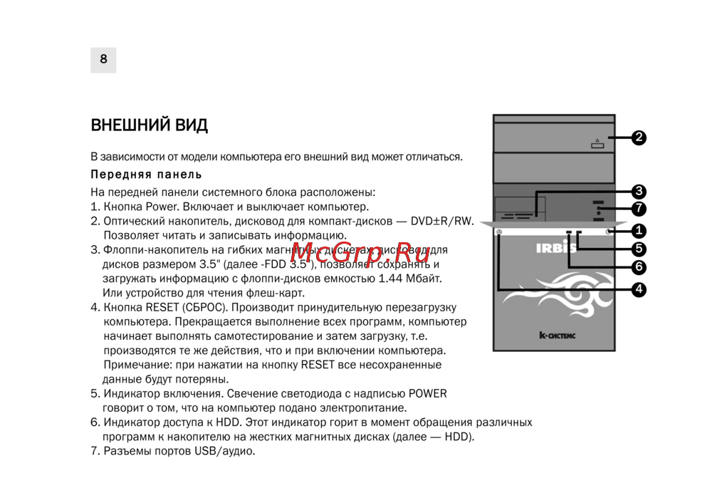 8 ВНЕШНИЙ ВИД В зависимости от модели компьютера его внешний вид может отличаться Передняя панель На передней панели системного блока расположены 1 Кнопка Power Включает и выключает компьютер 2 Оптический накопитель дисковод для компакт дисков DVD R RW Позволяет читать и записывать информацию 3 Флоппи накопитель на гибких магнитных дискетах дисковод для дисков размером 3 5 далее FDD 3 5 позволяет сохранять и загружать информацию с флоппи дисков емкостью 1 44 Мбайт Или устройство для чтения флеш карт 4 Кнопка RESET СБРОС Производит принудительную перезагрузку компьютера Прекращается выполнение всех программ компьютер начинает выполнять самотестирование и затем загрузку т е производятся те же действия что и при включении компьютера Примечание при нажатии на кнопку RESET все несохраненные данные будут потеряны 5 Индикатор включения Свечение светодиода с надписью POWER говорит о том что на компьютер подано электропитание 6 Индикатор доступа к HDD Этот индикатор горит в момент обращения различных программ к накопителю на жестких магнитных дисках далее HDD 7 Разъемы портов USB аудио