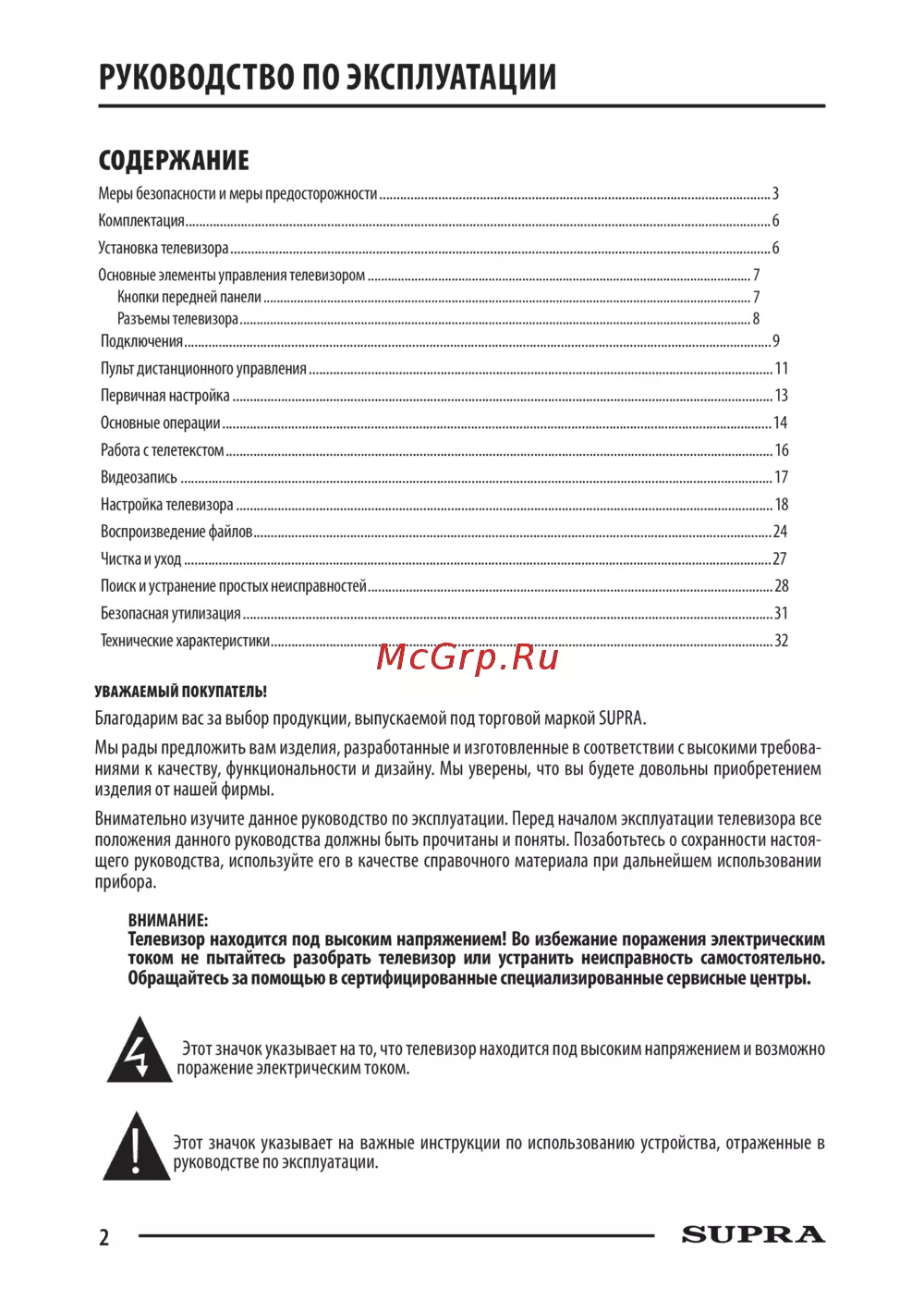 - Благодарим вас за выбор продукции выпускаемой под торговой маркой supra мы рады предложить вам изделия разработанные и изготовленные в соответствии с высокими требова ниями к качеству функциональности и дизайну мы уверены что вы будете довольны приобретением изделия от нашей фирмы внимательно изучите данное руководство по эксплуатации перед началом эксплуатации телевизора все положения данного руководства должны быть прочитаны и поняты позаботьтесь о сохранности настоя щего руководства используйте его в качестве справочного материала при дальнейшем использовании прибора p.2