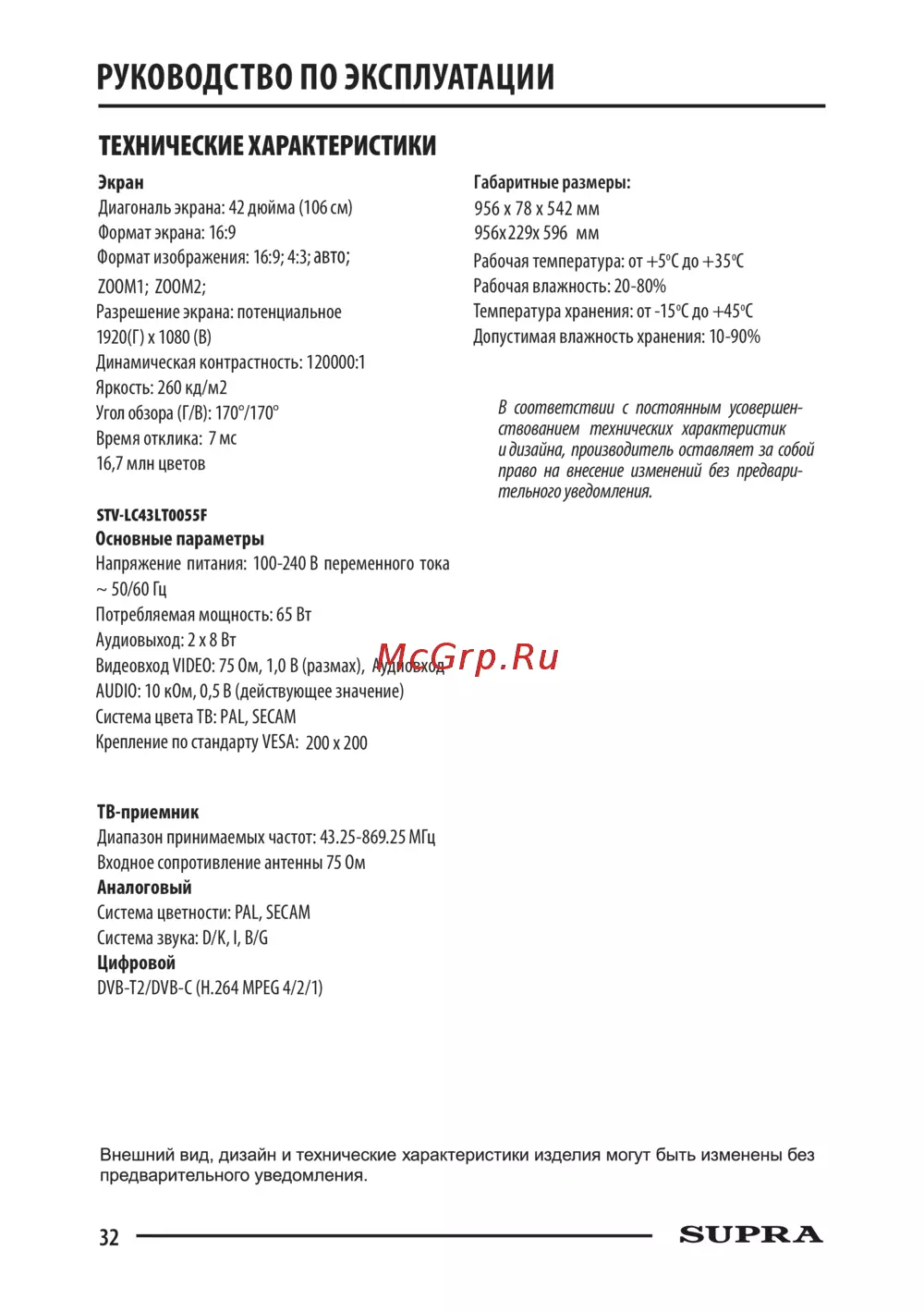 Supra STV-LC43LT0055F [32/36] Технические характеристики