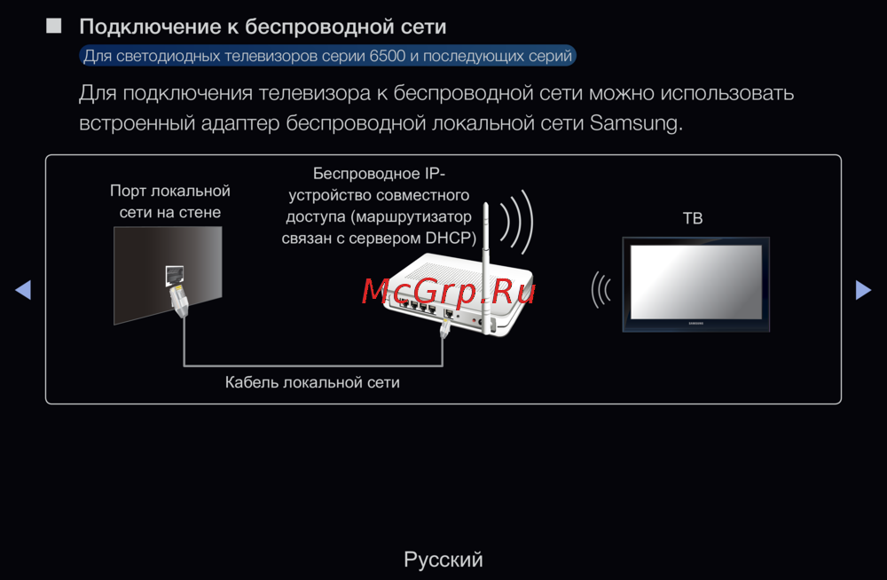 - Для подключения телевизора к беспроводной сети можно использовать встроенный адаптер беспроводной локальной сети samsung p.103