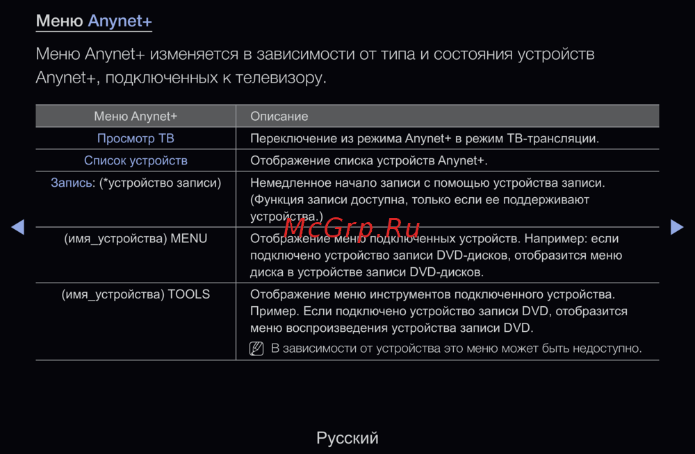 Меню Anynet+ изменяется в зависимости от типа и состояния устройств