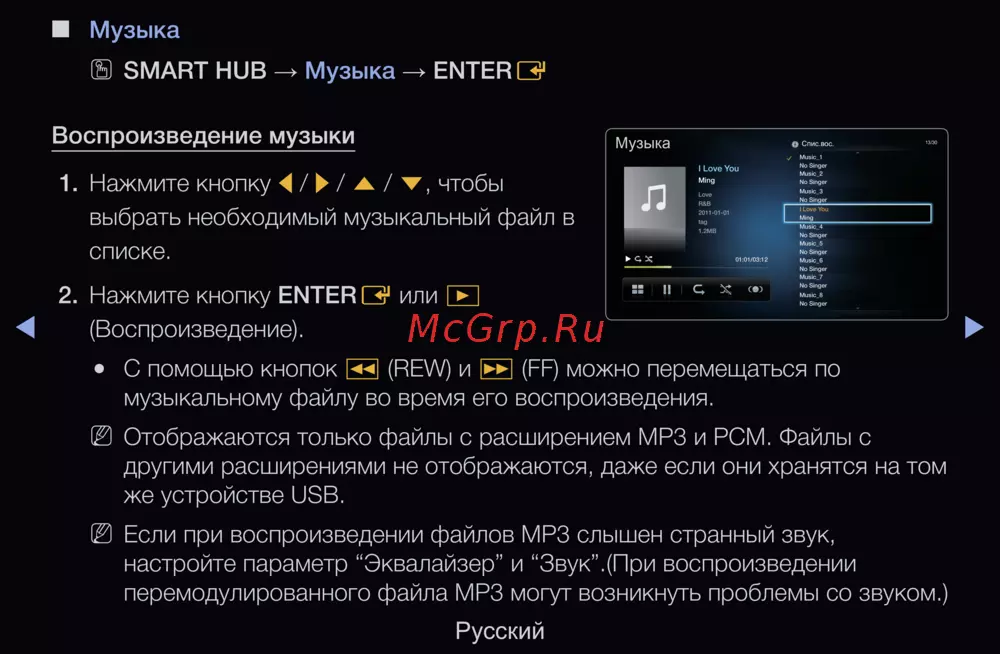 - Если при воспроизведении файлов mp3 слышен странный звук настройте параметр эквалайзер и звук при воспроизведении перемодулированного файла mp3 могут возникнуть проблемы со звуком p.253