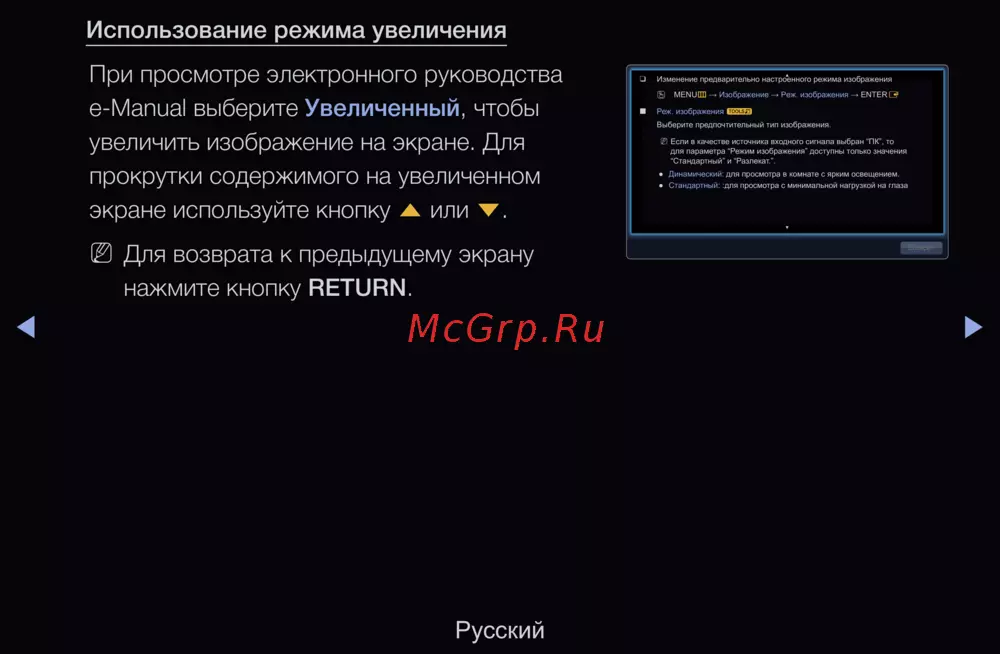Узнайте, как использовать режим увеличения для просмотра изображений в электронном руководстве. Прокручивайте содержимое и изменяйте режимы изображения для комфортного просмотра.