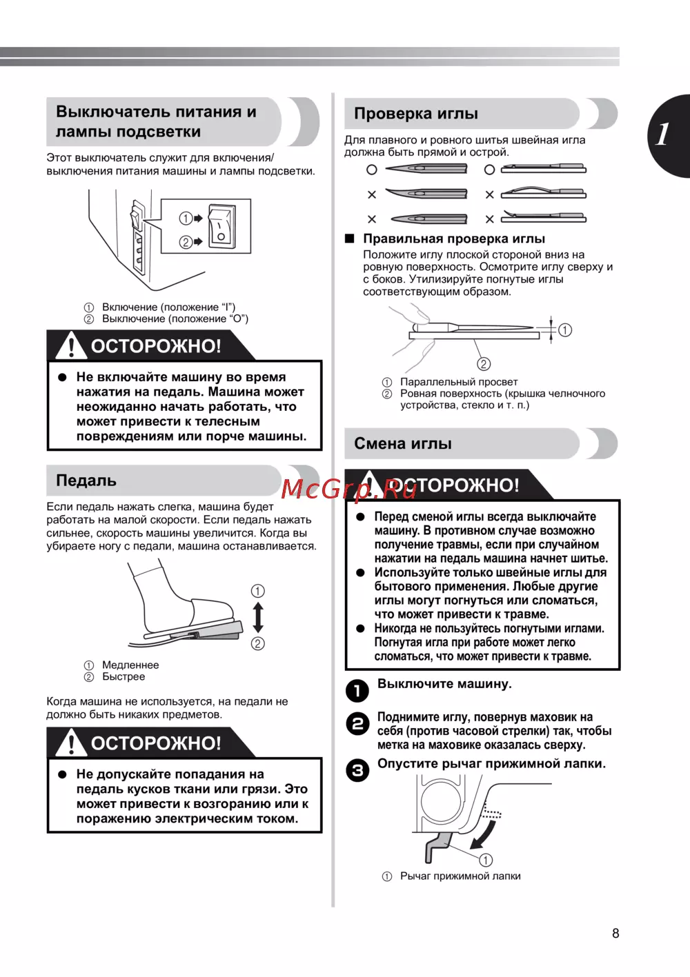 - Не включайте машину во время нажатия на педаль машина может неожиданно начать работать что может привести к телесным повреждениям или порче машины p.40
