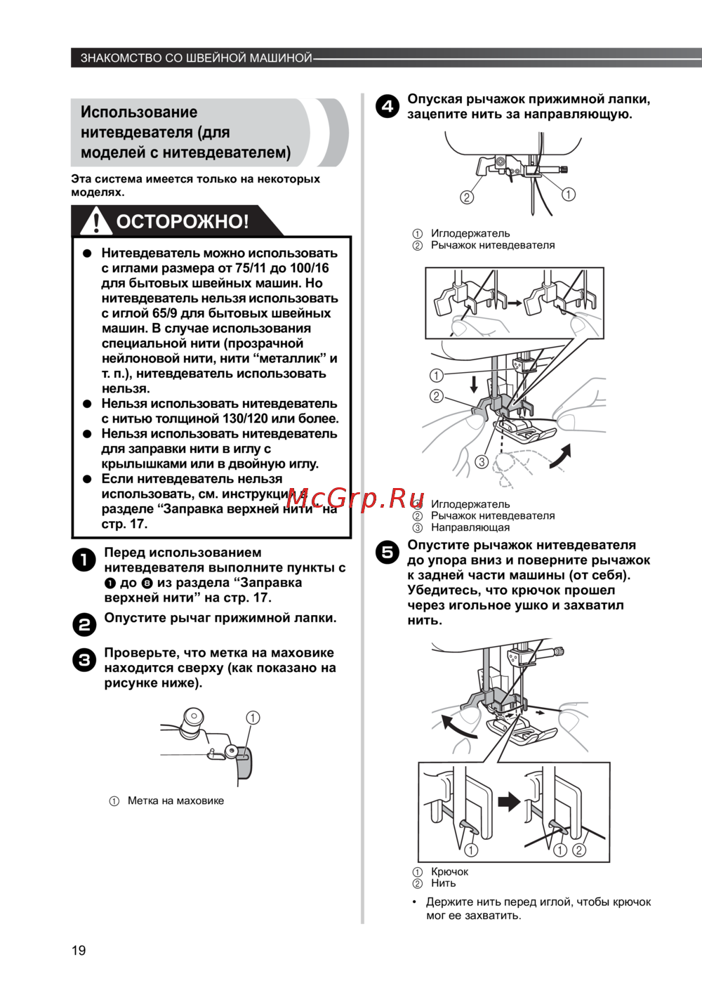 - Убедитесь что шпульный колпачок вставлен правильно так как в противном случае игла может сломаться p.42
