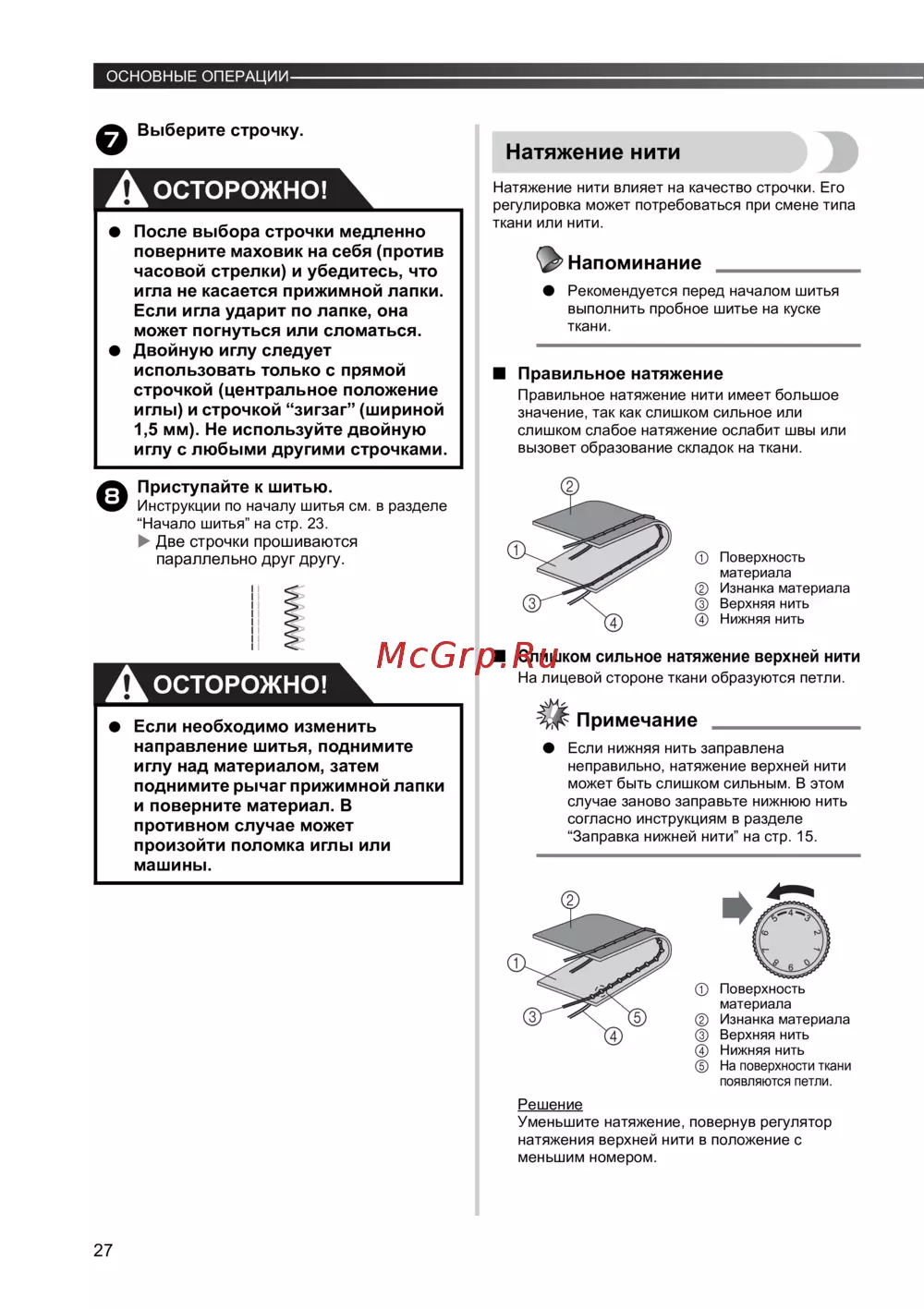 - Убедитесь что шпульный колпачок вставлен правильно так как в противном случае игла может сломаться p.42