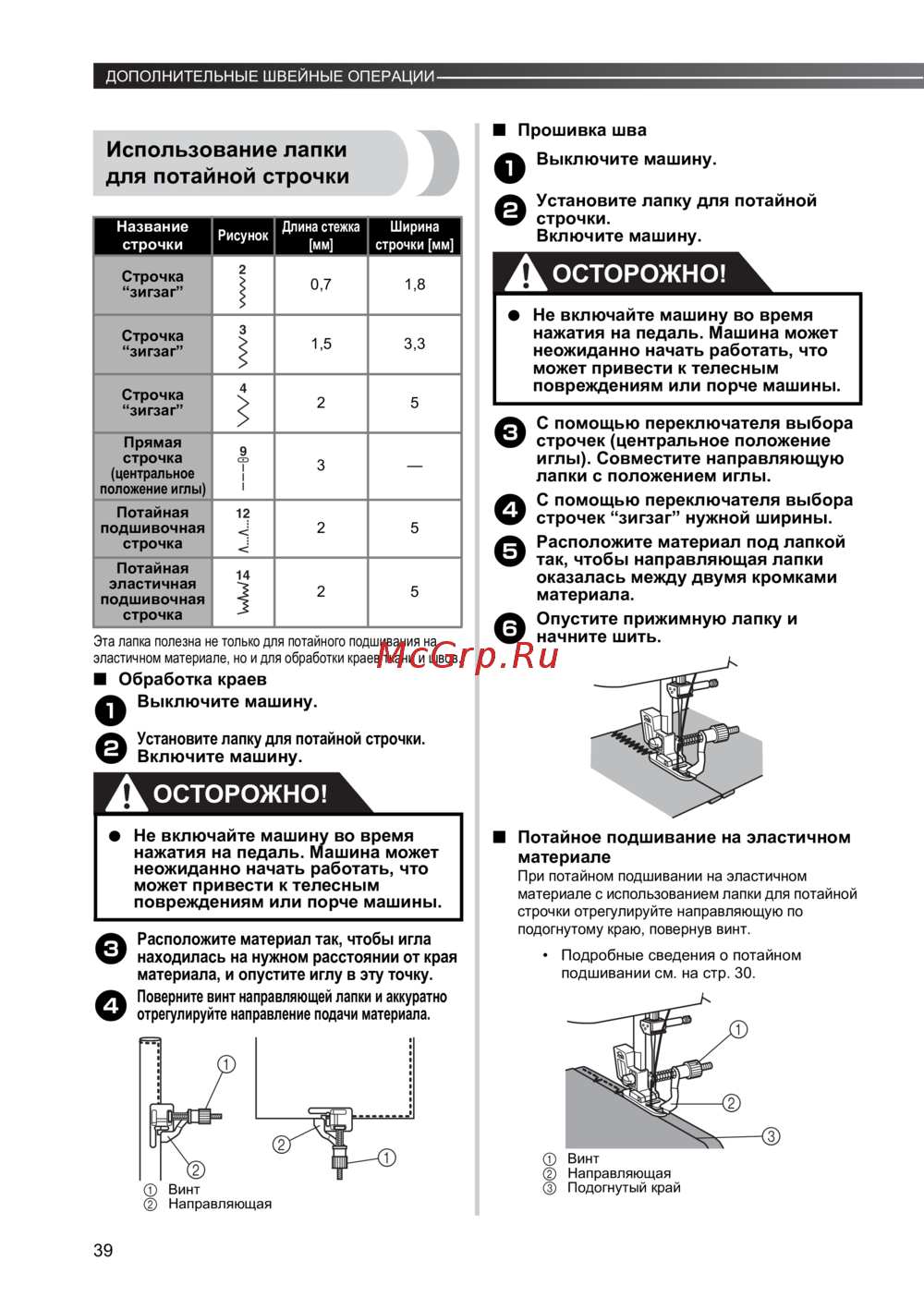 - Расположите материал под лапкой так чтобы направляющая лапки оказалась между двумя кромками материала p.40