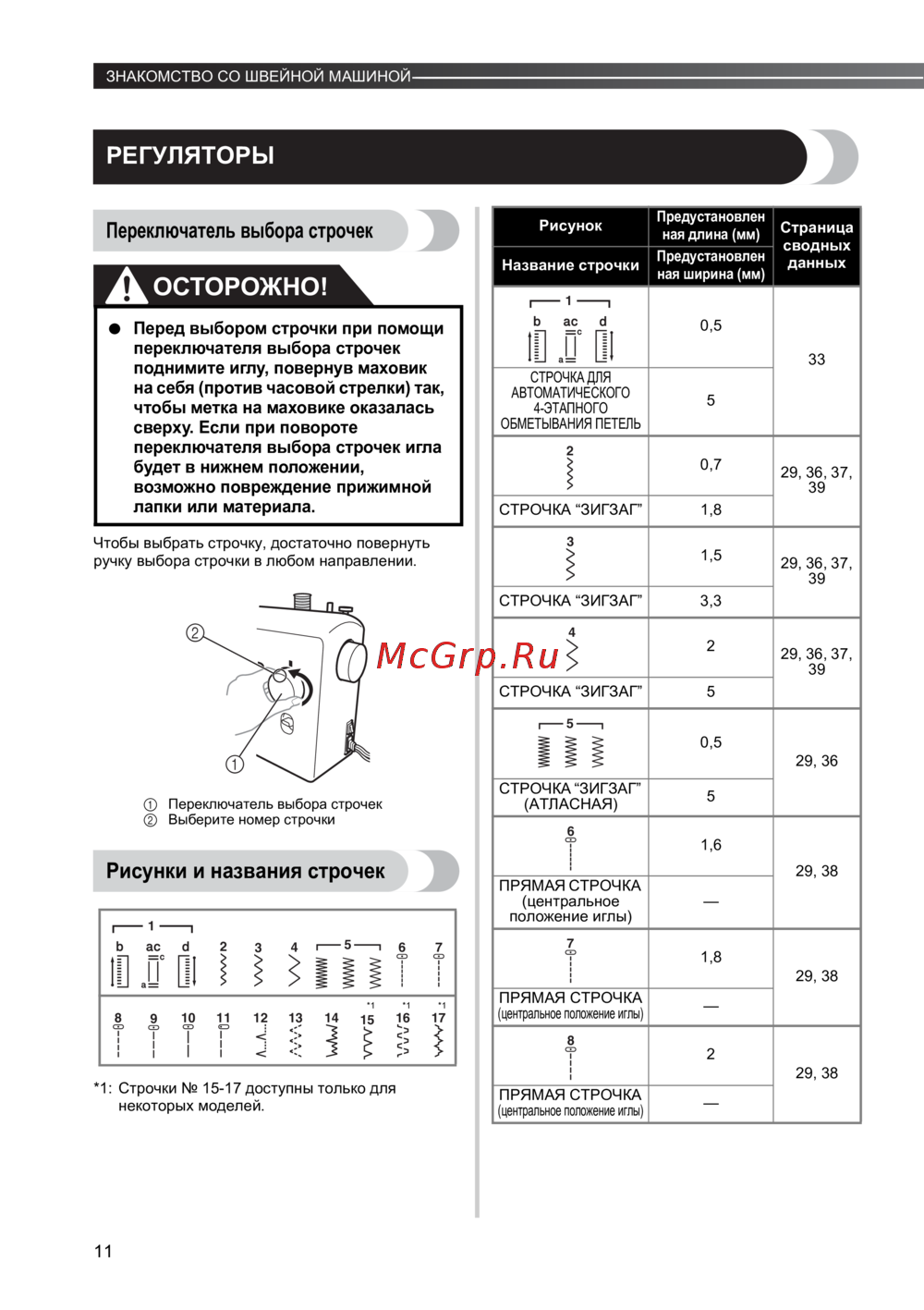 - С помощью переключателя выбора строчек зигзаг нужной ширины p.40