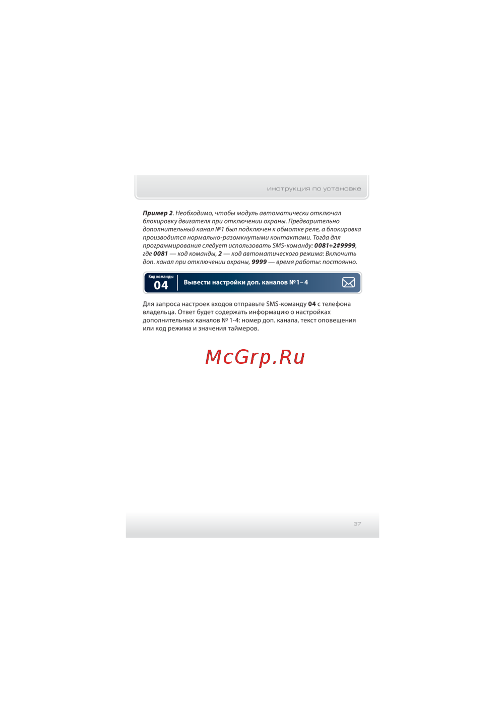 - Пример 1 допустим к дополнительному каналу 3 подключено оборудование которым предполагается управлять с телефона например предпусковой подогреватель двигателя необходимо чтобы после включения оборудование работало 30 минут а затем автоматически отключалось тогда для программирования выхода 3 с телефона владельца следует отправить следующее sms сообщение 0083 подогрев вкл 1800 где 0083 код команды подогрев вкл обозначение дополнительного канала 1800 время работы в секундах p.36