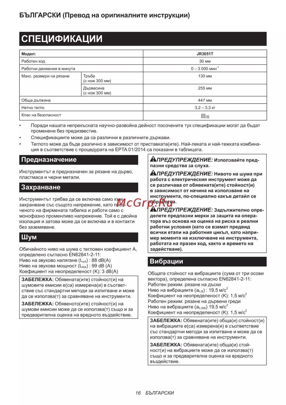 Makita JR3051TK — спецификации и характеристики на инструменти за рязане [16/44]