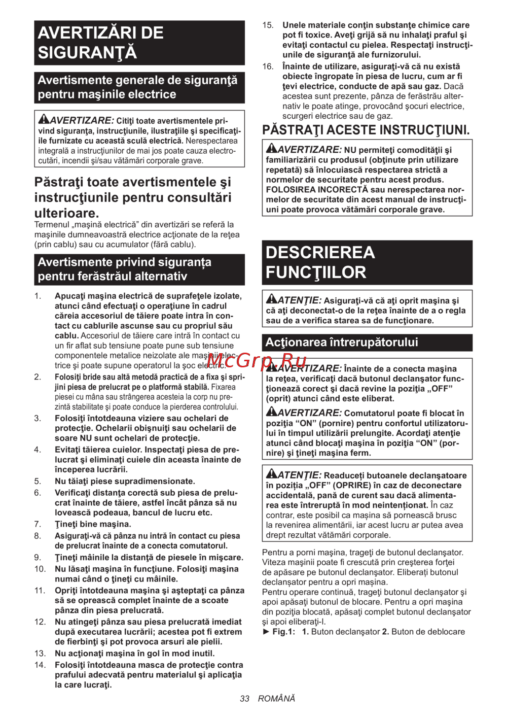 - Avertismente privind siguranța pentru ferăstrăul alternativ p.33