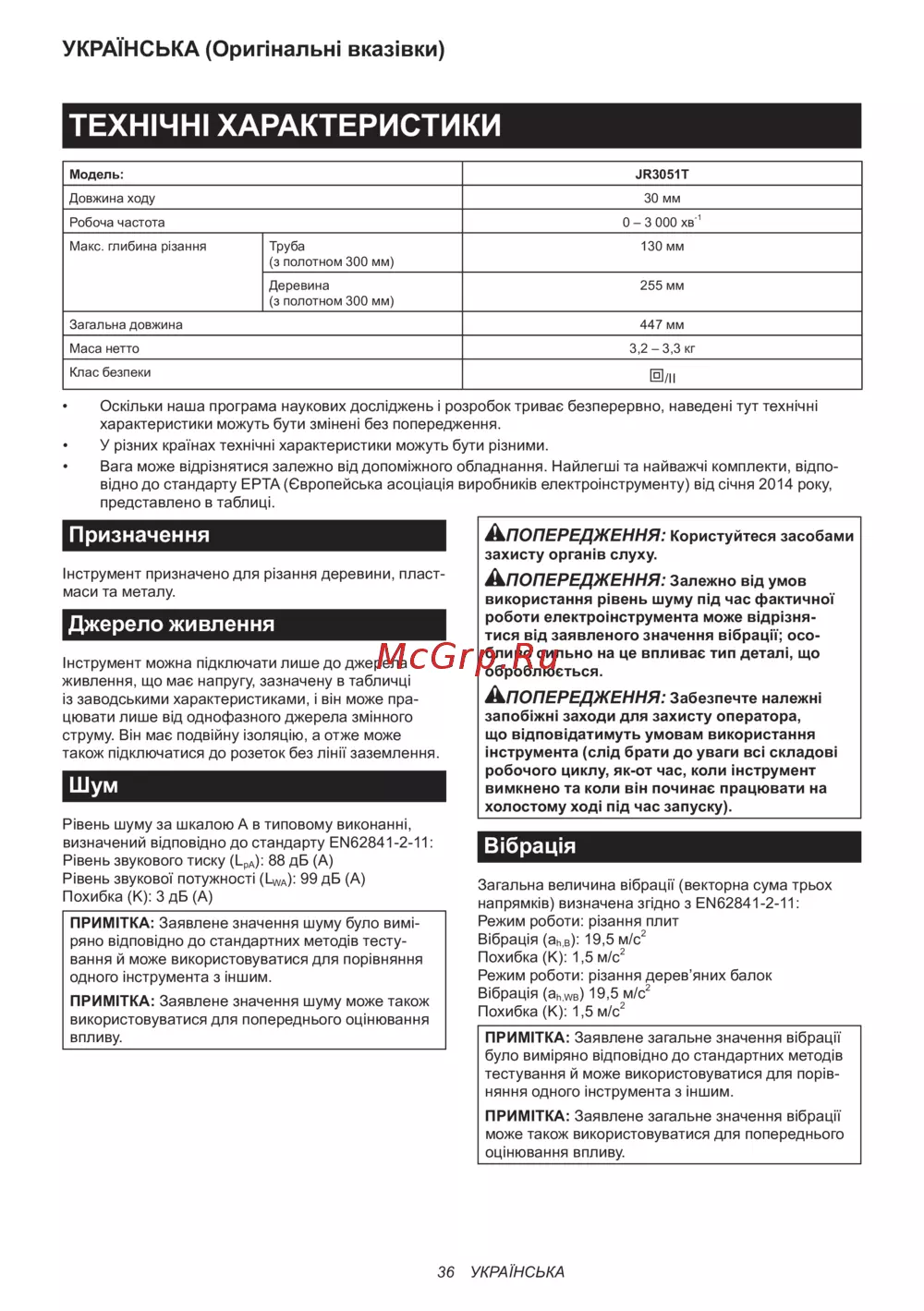 Дізнайтеся про технічні характеристики електроінструмента для різання деревини, пластику та металу. Важливі дані про глибину різання, вібрацію та шум.