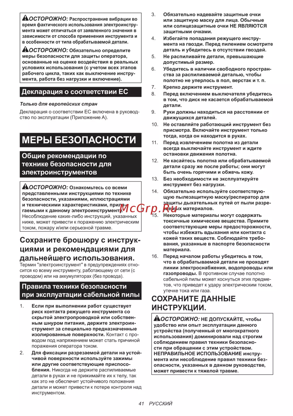 - Правила техники безопасности при эксплуатации сабельной пилы p.41