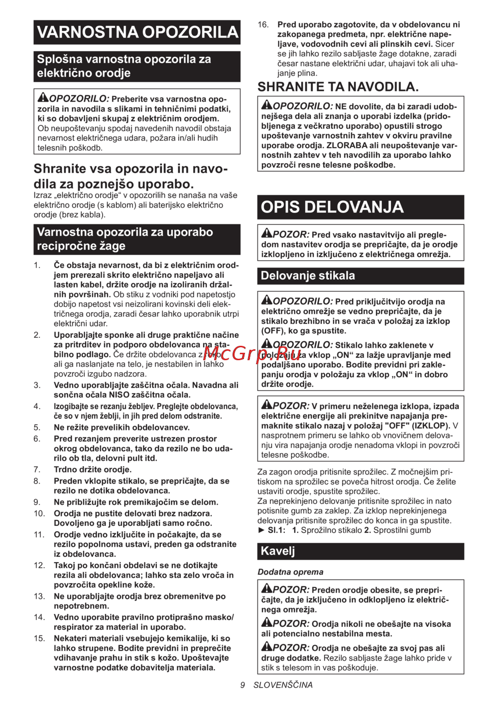 Preberite pomembna varnostna opozorila za pravilno uporabo električnega orodja. Upoštevajte navodila za zaščito pred električnim udarom in poškodbami.