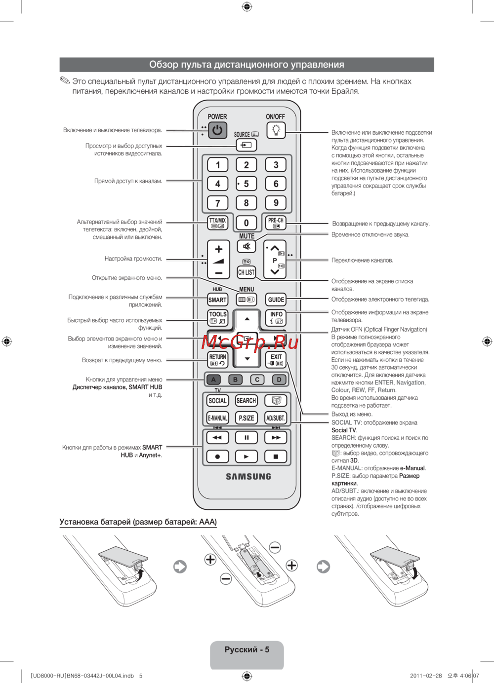 Samsung UE40D8000YS [27/84] Это специальный пульт дистанционного управления для людей с плохим зрением на кнопках питания переключения каналов и настройки громкости имеются точки брайля