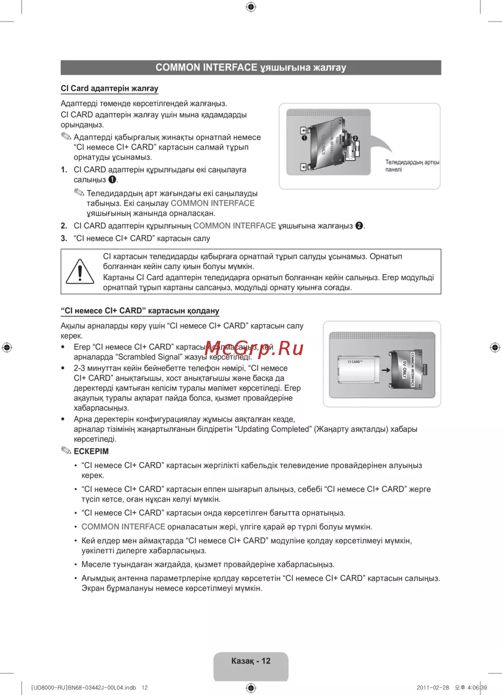 CI картасын теледидарды қабырғаға орнатпай тұрып салуды ұсынамыз. Орнатып