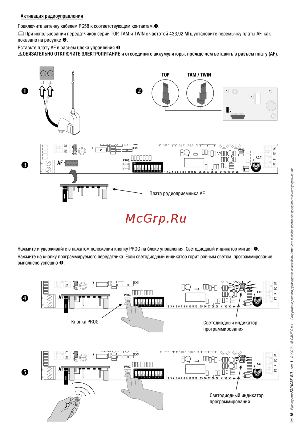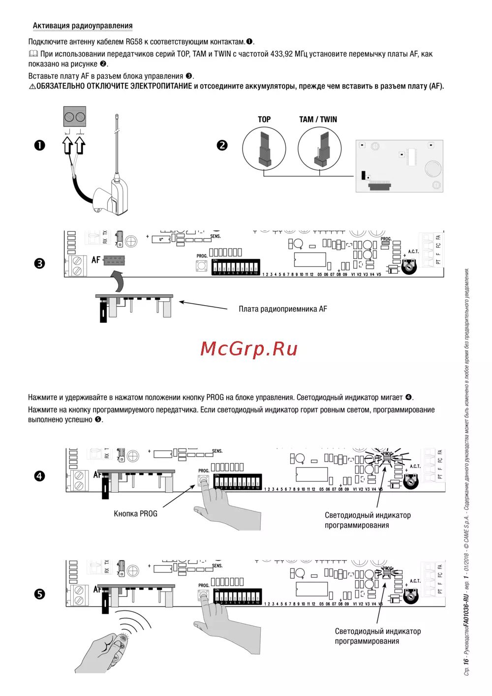 - Подключите антенну кабелем rg58 к соответствующим контактам при использовании передатчиков серий top tam и twin с частотой 433 92 мгц установите перемычку платы af как показано на рисунке вставьте плату af в разъем блока управления обязательно отключите электропитание и отсоедините аккумуляторы прежде чем вставить в разъем плату af p.16