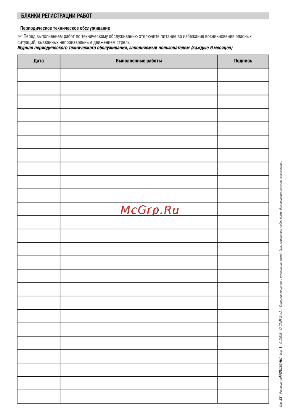 Стр. 22 - РуководствоFA01 036-RU - вер. 1 - 01/2018 - © CAME S.p.A. - Содержание данного руководства может быть изменено в любое время без предварительного уведомления.