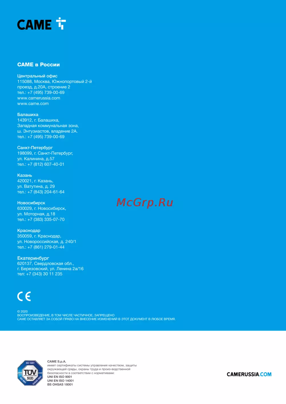 CAME ОСТАВЛЯЕТ ЗА СОБОЙ ПРАВО НА ВНЕСЕНИЕ ИЗМЕНЕНИЙ В ЭТОТ ДОКУМЕНТ В ЛЮБОЕ ВРЕМЯ.