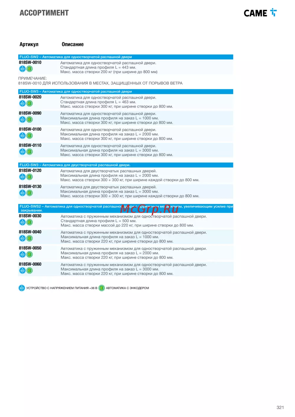 - В таблице кратко изложены серии и модели приводов с ограничениями в использовании в зависимости от массы и ширины створки p.15