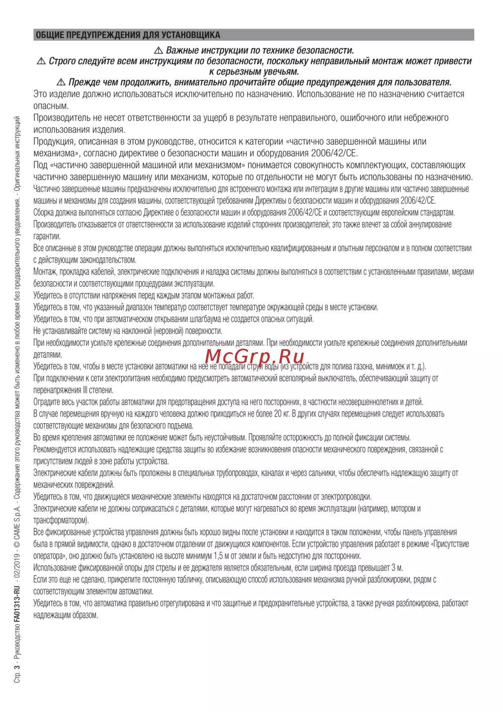 Стр. 3 - Руководство FA01313-RU - 02/2019 - © CAME S.p.A. - Содержание этого руководства может быть изменено в любое время без предварительного уведомления. - Oригинальных инструкций