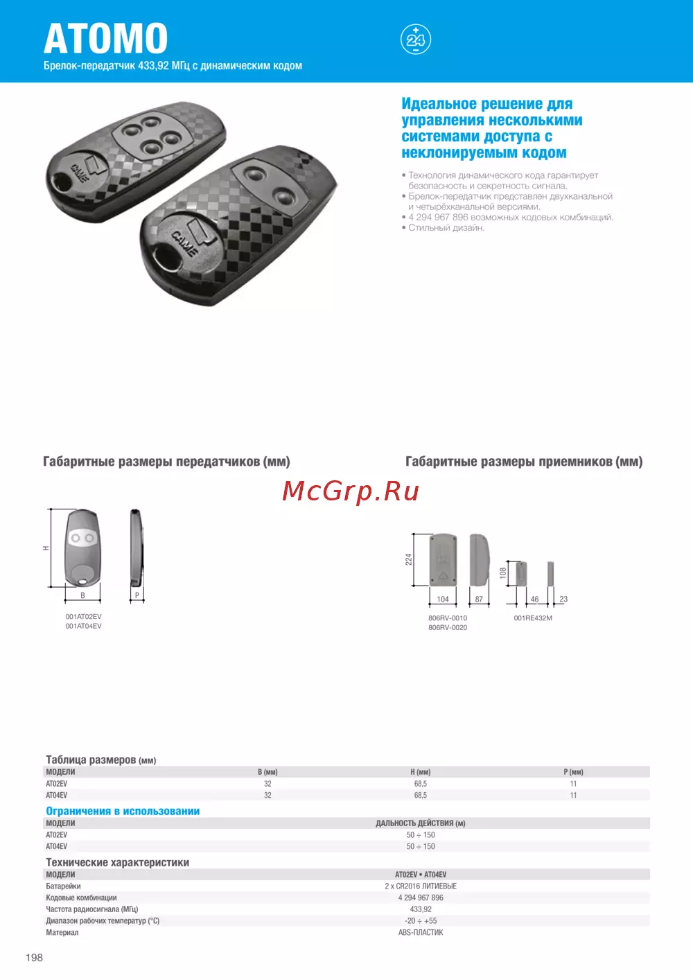 Came GPX40MGP — технические характеристики радиопередатчиков с динамическим кодом [199/362]