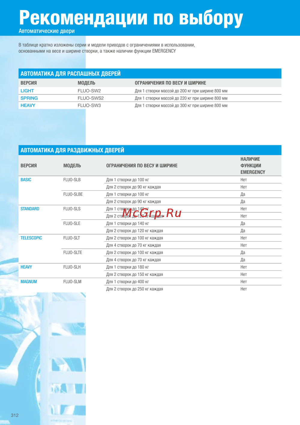 - В таблице кратко изложены серии и модели приводов с ограничениями в использовании в зависимости от массы и ширины створки p.15