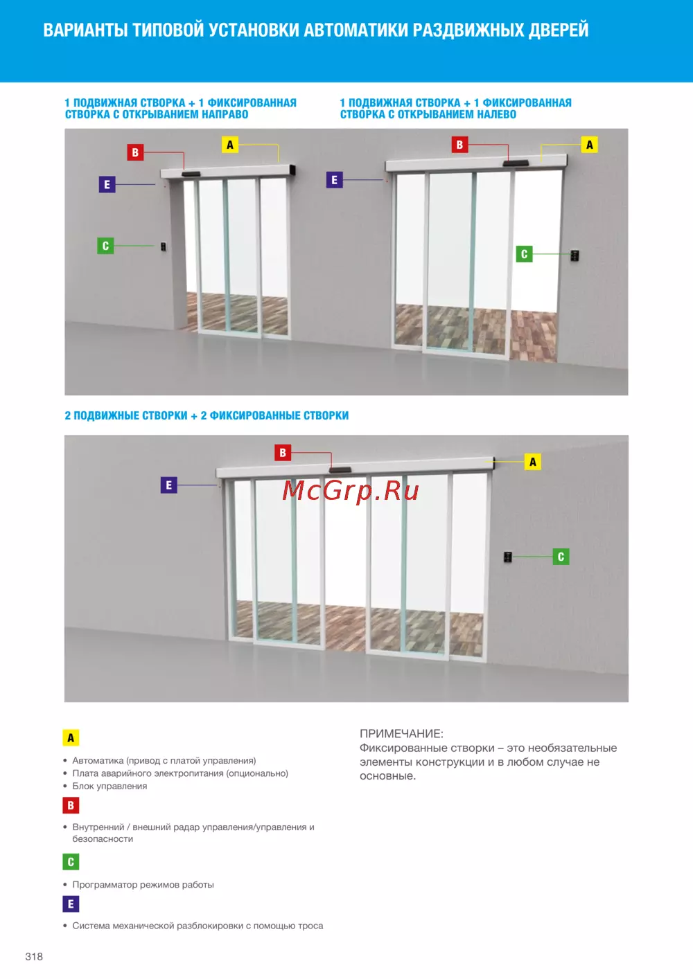 - Перед установкой автоматики необходимо обязательно проверить следующее автоматика должна быть установлена с правильной стороны створок позволяющей их открывание от себя при одностворчатом механизме или при неподвижных створках следует выбрать правильное расположение автоматики для создания дверей распашного типа для обеспечения полного соответствия аварийного выхода нормативным требованиям необходимо обеспечить минимальную ширину выхода 1200 мм в коммерческих структурах необходимо учитывать минимально допустимую ширину двери для установки автоматики и для движения створок p.345