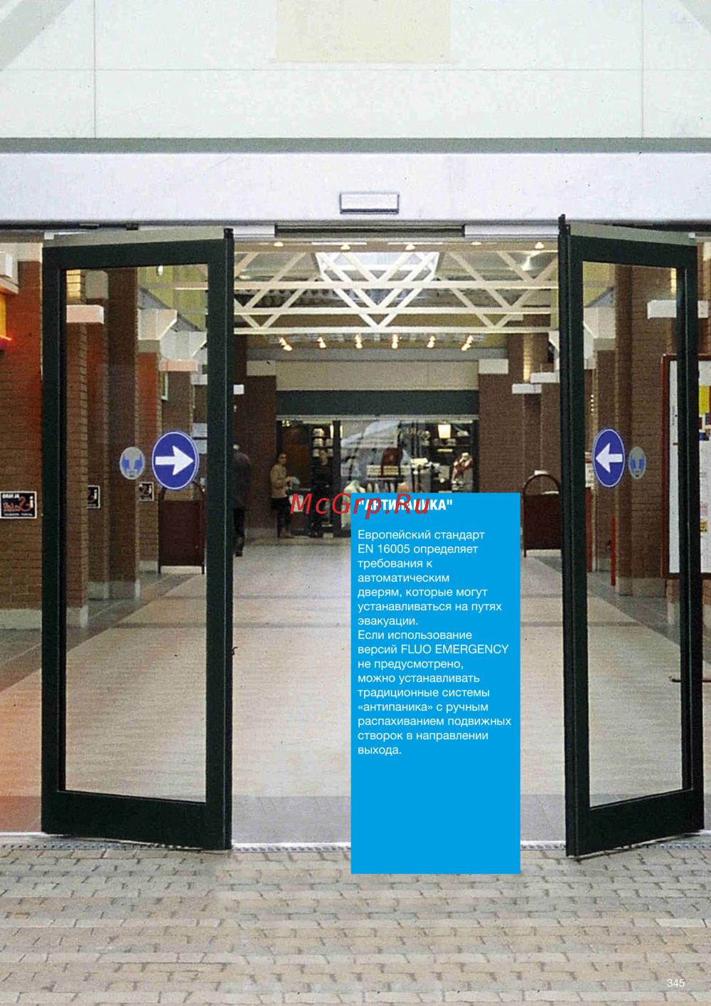 - Перед установкой автоматики необходимо обязательно проверить следующее автоматика должна быть установлена с правильной стороны створок позволяющей их открывание от себя при одностворчатом механизме или при неподвижных створках следует выбрать правильное расположение автоматики для создания дверей распашного типа для обеспечения полного соответствия аварийного выхода нормативным требованиям необходимо обеспечить минимальную ширину выхода 1200 мм в коммерческих структурах необходимо учитывать минимально допустимую ширину двери для установки автоматики и для движения створок p.345