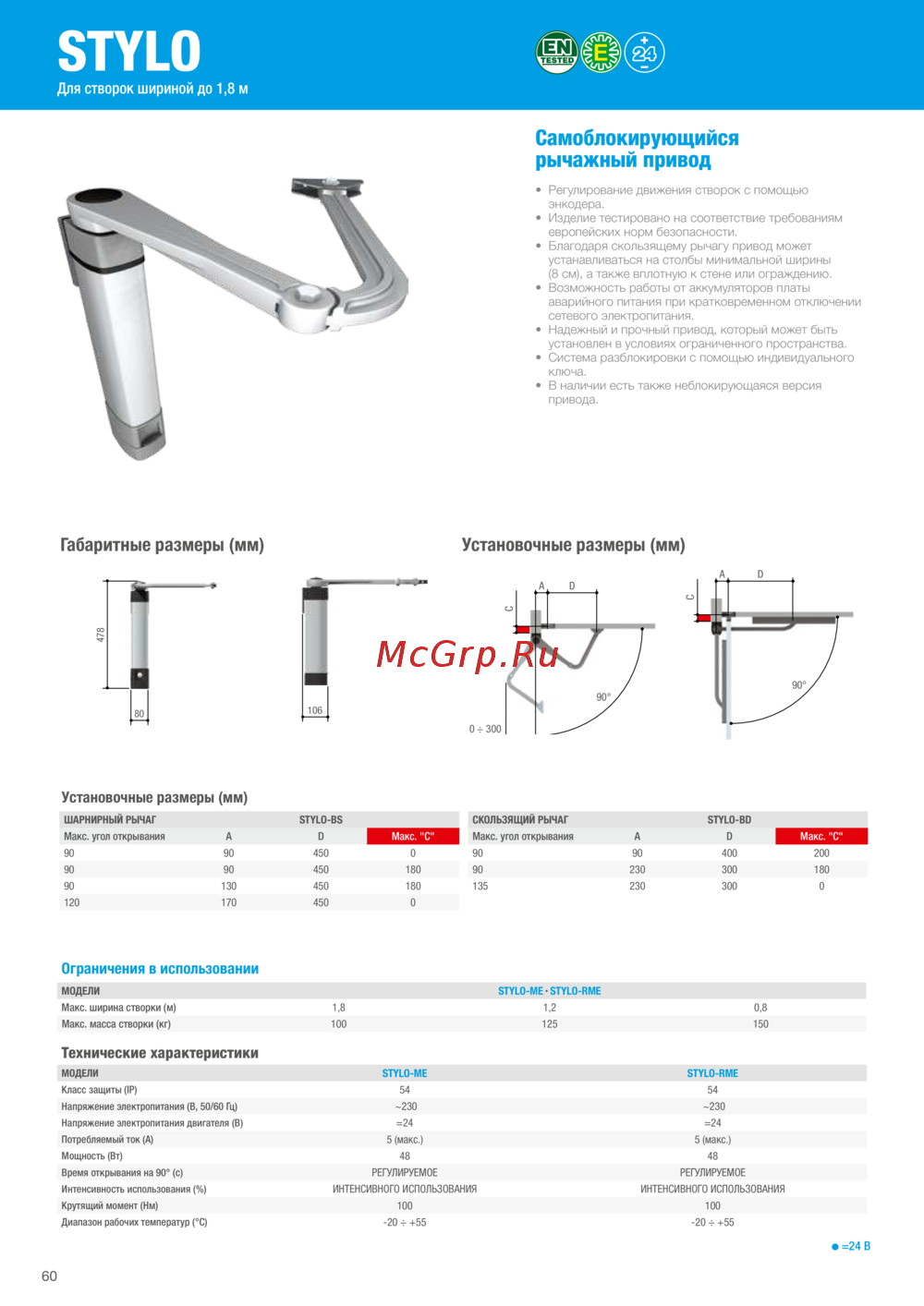 - В таблице кратко изложены серии и модели приводов с ограничениями в использовании в зависимости от массы и ширины створки p.15