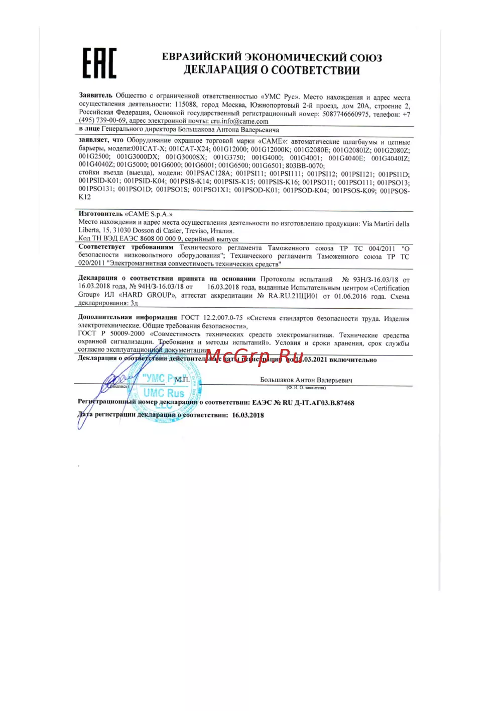 ЕНГ ЕВРАЗИЙСКИЙ ЭКОНОМИЧЕСКИЙ СОЮЗ ДЕКЛАРАЦИЯ О СООТВЕТСТВИИ Заявитель Общество с ограниченной ответственностью УМС Рус Место нахождения и адрес места осуществления деятельности 115088 город Москва Южнопортовый 2 й проезд дом 20А строение 2 Российская Федерация Основной государственный регистрационный номер 5087746660975 телефон 7 495 739 00 69 адрес электронной почты cru info caine com________________________________ в лице Генерального директора Большакова Антона Валерьевича заявляет что Оборудование охранное торговой марки САМЕ автоматические шлагбаумы и цепные барьеры модели 001САТ Х 001САТ Х24 001G12000 001G12000К 001G2080E 001G2080IZ 001G2080Z 001G25OO 001G3000DX OO1G3O0OSX OO1G3750 001G4000 001G4Û01 001G4040E 00IG4040IZ 001G4040Z 001G5000 001G6000 001G6ÛÛ1 001G6500 00IG6501 803ВВ 0О7О стойки въезда выезда модели 001PSAC128A 001PSI11 001PSI111 001RS 12 001PSI121 001PSI1D 00ÏPSID K01 001PSID K04 001PSIS K14 001PSIS K15 001PSIS K16 001PSO11 001PSO111 001PSO13 001PSO131 001PSO1D 00 IPSO IS 00 IPSO 1X1 001PSOD K01 001PSOD K04 001PSOS KG9 001PSOSK12 Изготовитель CAME S p A Место нахождения и адрес места осуществления деятельности по изготовлению продукции Via Martin della Liberta 15 31030 Dosson di Casier Treviso Италия Код 1Н ВЭД ЕАЭС 8608 00 000 9 серийный выпуск___________________ ________________________ Соответствует требованиям Технического регламента Таможенного союза ТР ТС 004 2011 О безопасности низковольтного оборудования Технического регламента Таможенного союза ТР ТС 020 2011 Электромагнитная совместимость технических средств о соответствии принята па основании Протоколы испытаний 93Н 3 16 03 18 от 16 03 2018 года 94Н 3 16 03 18 от 16 03 2018 года выданные Испытательным центром Certification Group ИЛ HARD GROUP аттестат аккредитации RA RU 21IHH01 от 01 06 2016 года Схема декларирования Зд Декларация информация ГОСТ 12 2 007 0 75 Система стандартов безопасности труда Изделия электротехнические Общие требования безопасности ГОС I Р 50009 2000 Совместимость технических средств электромагнитная Технические средства охранной сигнализации Требования и методы испытаний Условия и сроки хранения срок службы согласно эксплуатациощфй документации _________________ Дополнительная Декларация о соо у вии действительна с даты регистрации по 15 03 2021 включительно ________ f ______ М П Í i i 1 UMC Rus Ш Большаков Антон Валерьевич ф ИО заяв Peí peí рационный номер декларации о соответствии ЕАЭС RU Д 1Т АГ03 В 87468 Дуа регистрации декларации о соответствии 16 03 2018