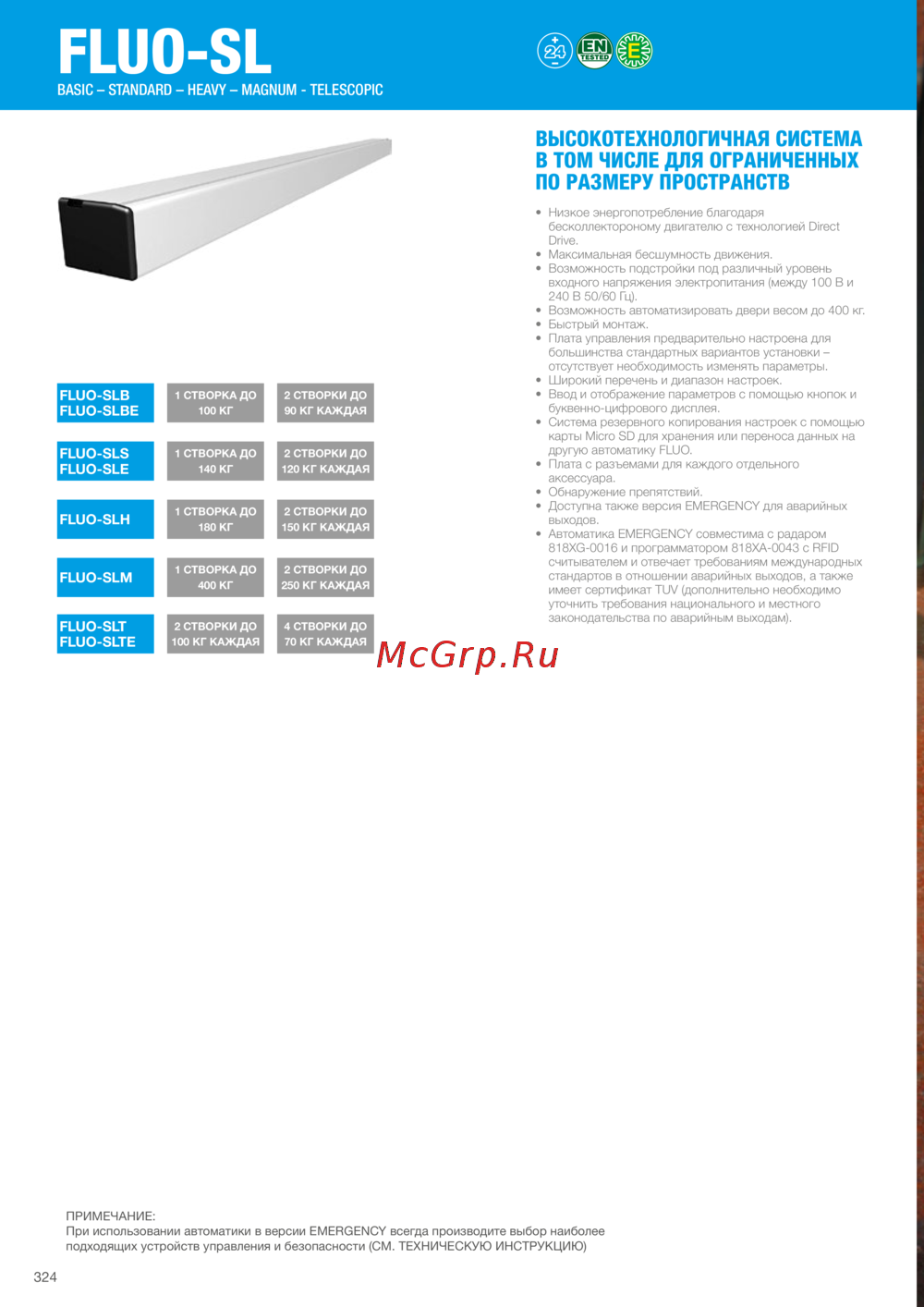 - В таблице кратко изложены серии и модели приводов с ограничениями в использовании в зависимости от массы и ширины створки p.15