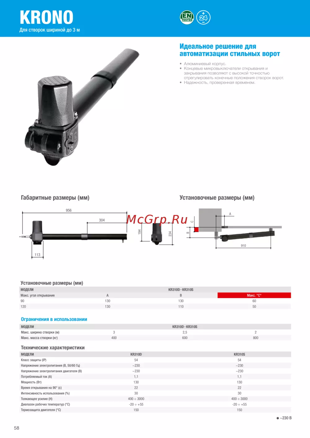 - В таблице кратко изложены серии и модели приводов с ограничениями в использовании в зависимости от массы и ширины створки p.15