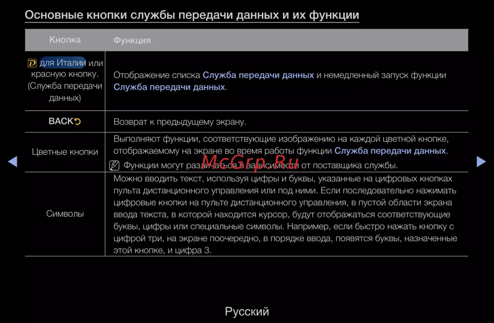 Узнайте о функциях основных кнопок службы передачи данных. Обзор работы с пультом и ввод текста с помощью цифровых кнопок. Подробности внутри.