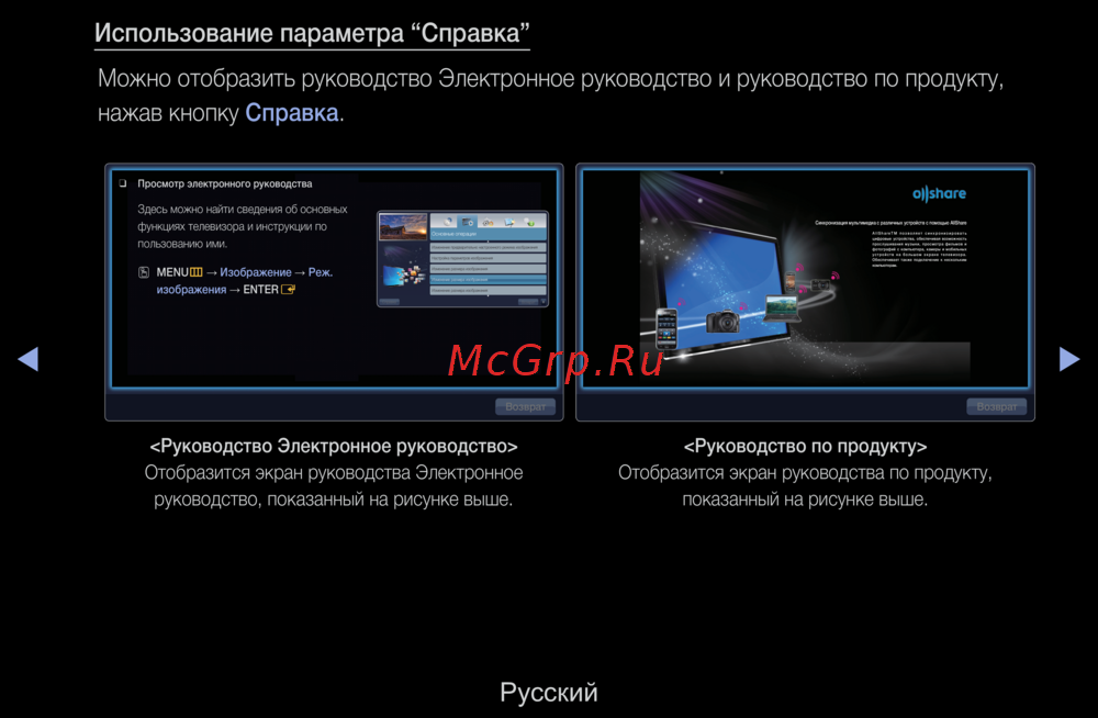- Можно отобразить руководство электронное руководство и руководство по продукту нажав кнопку справка p.292