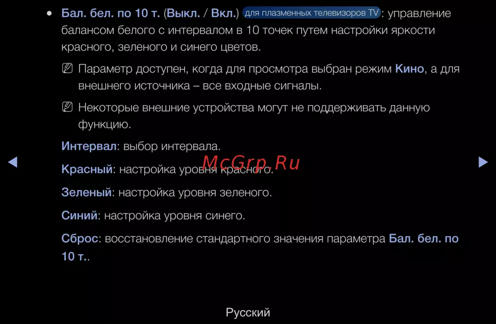 Управляйте балансом белого на плазменных телевизорах с помощью 10 точек настройки. Регулируйте яркость красного, зеленого и синего цветов для идеального изображения.