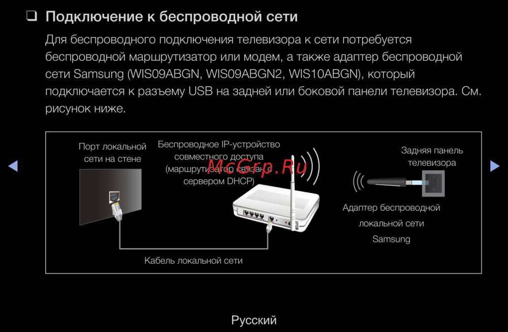 - При подключении адаптера беспроводной локальной сети samsung выключите а затем включите тв p.103