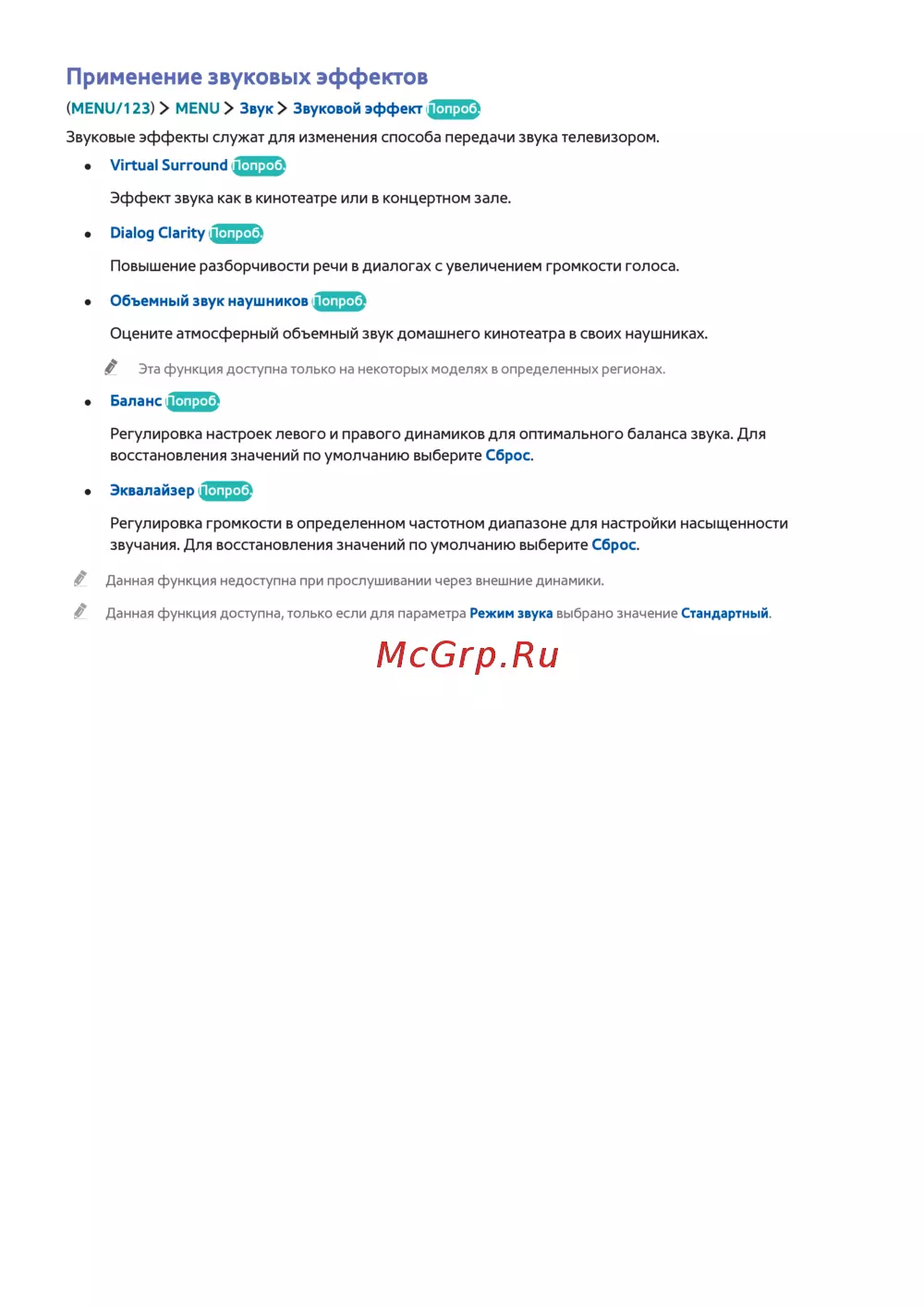 Звуковые эффекты служат для изменения способа передачи звука телевизором.