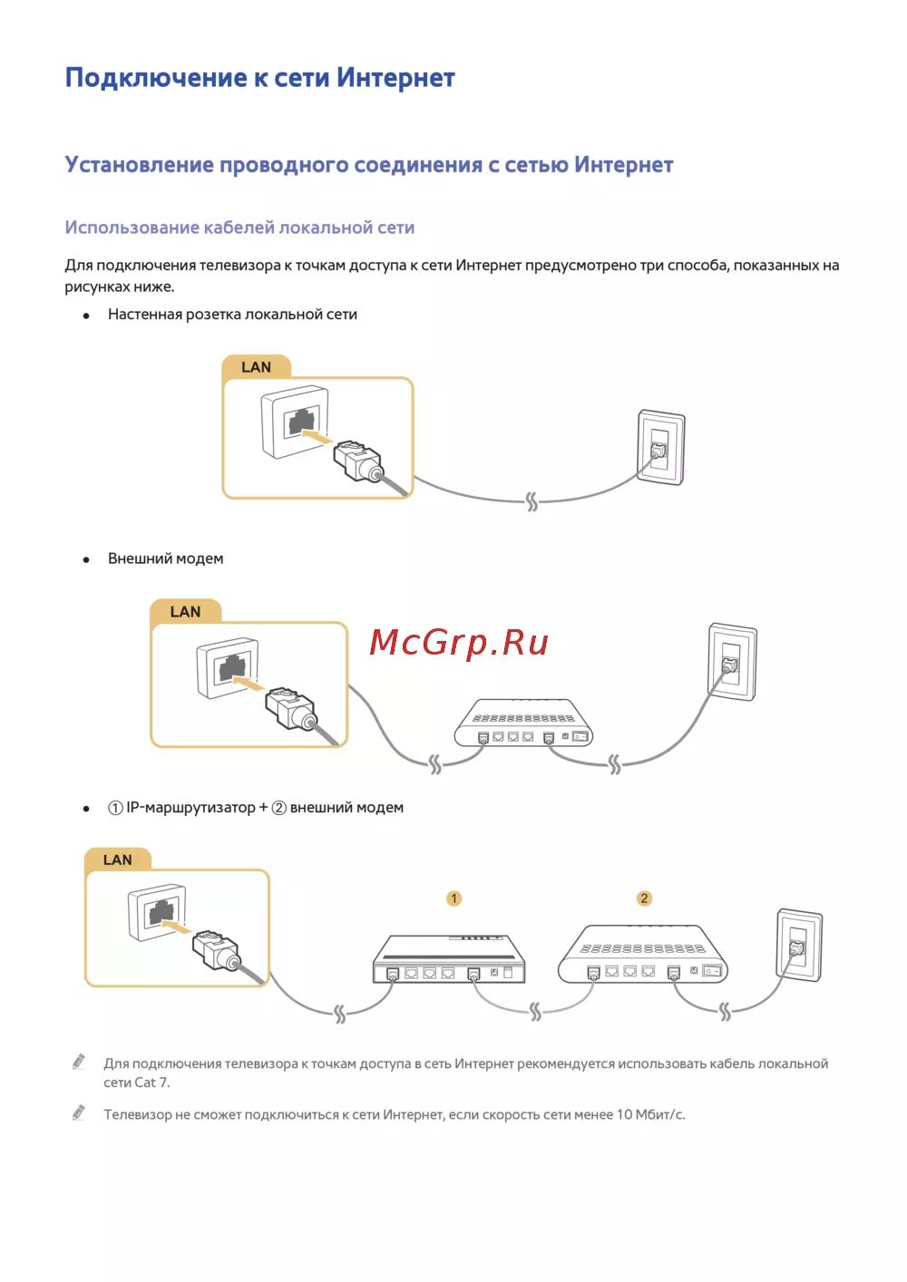 Телевизор не сможет подключиться к сети Интернет, если скорость сети менее 10 Мбит/с.