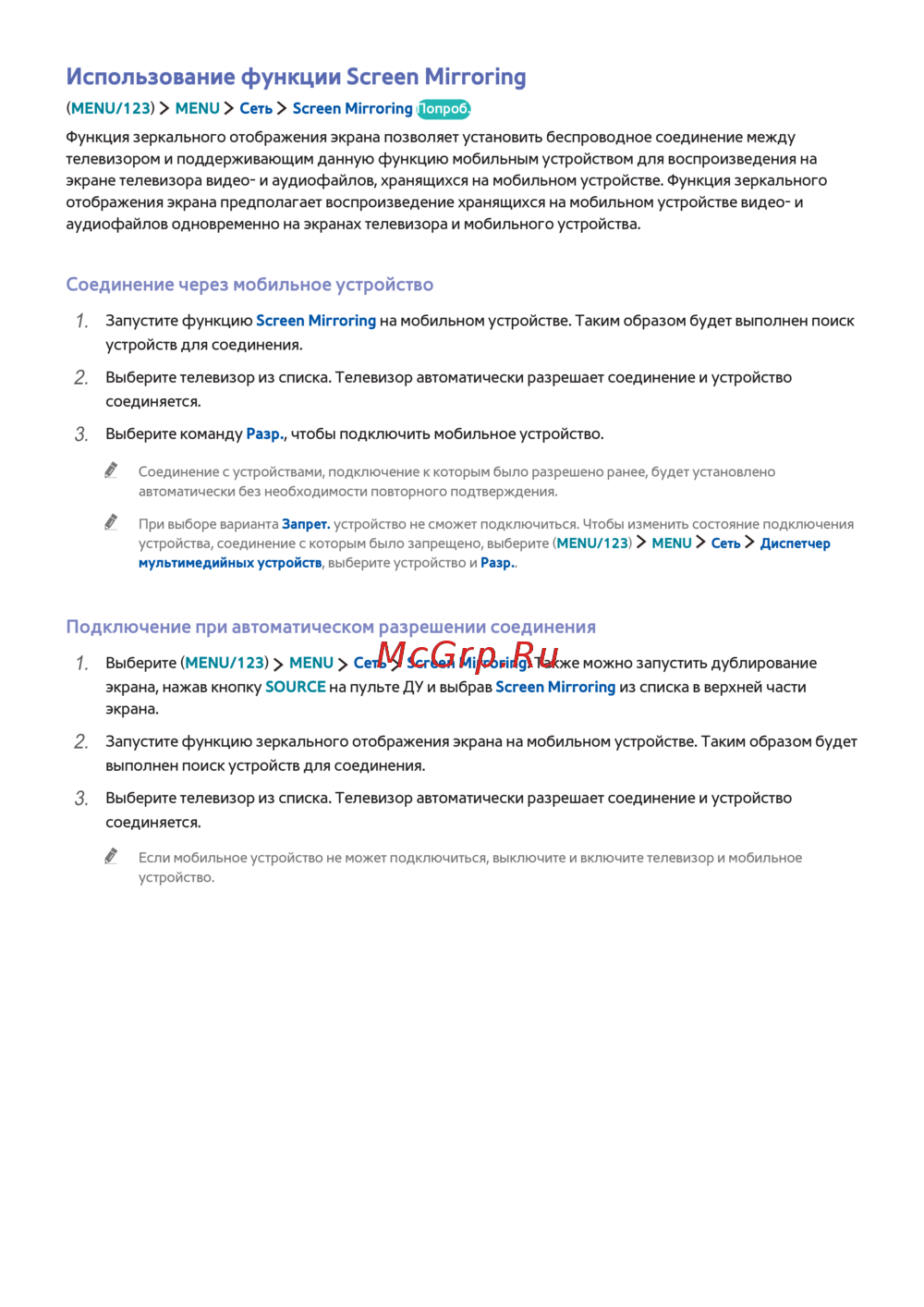 телевизором и поддерживающим данную функцию мобильным устройством для воспроизведения на