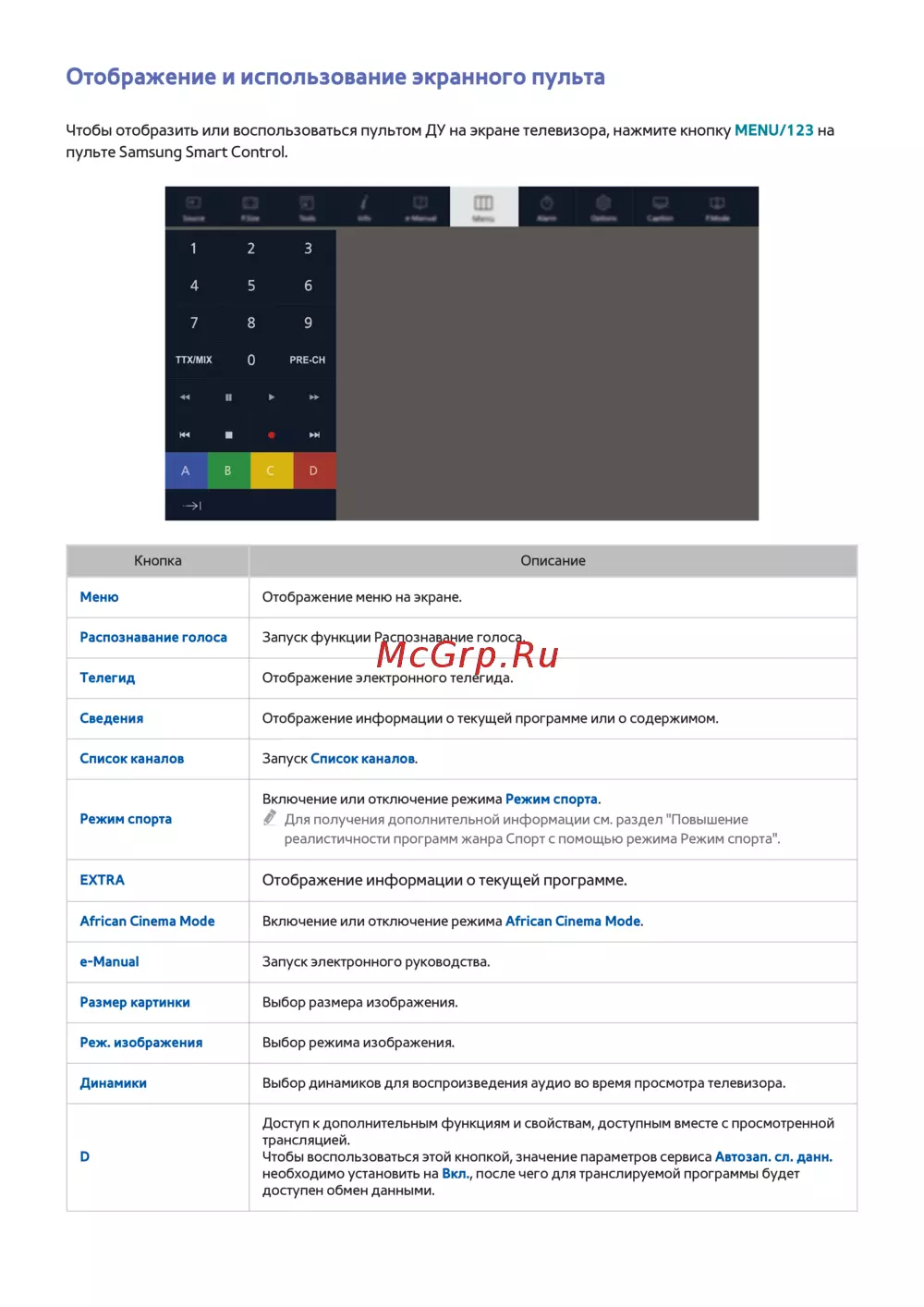 Чтобы отобразить или воспользоваться пультом ДУ на экране телевизора, нажмите кнопку MENU/123 на